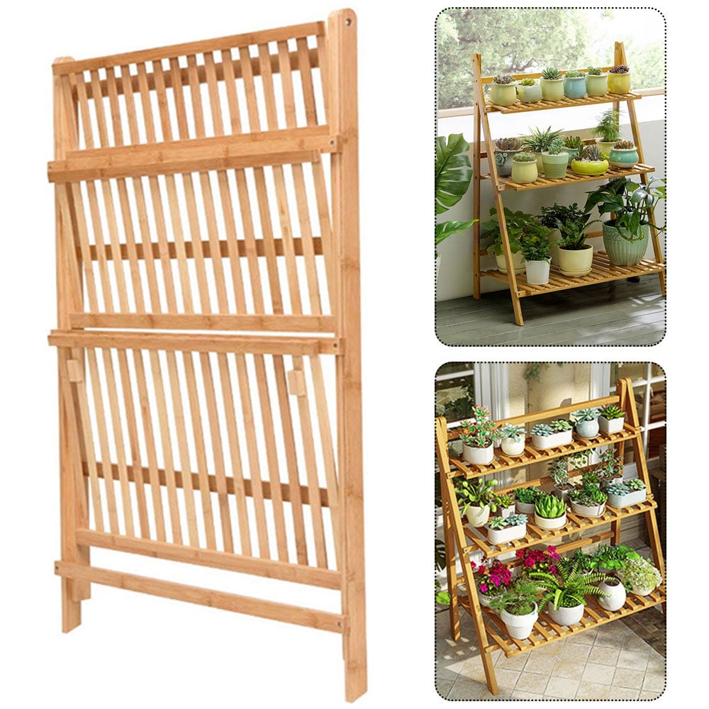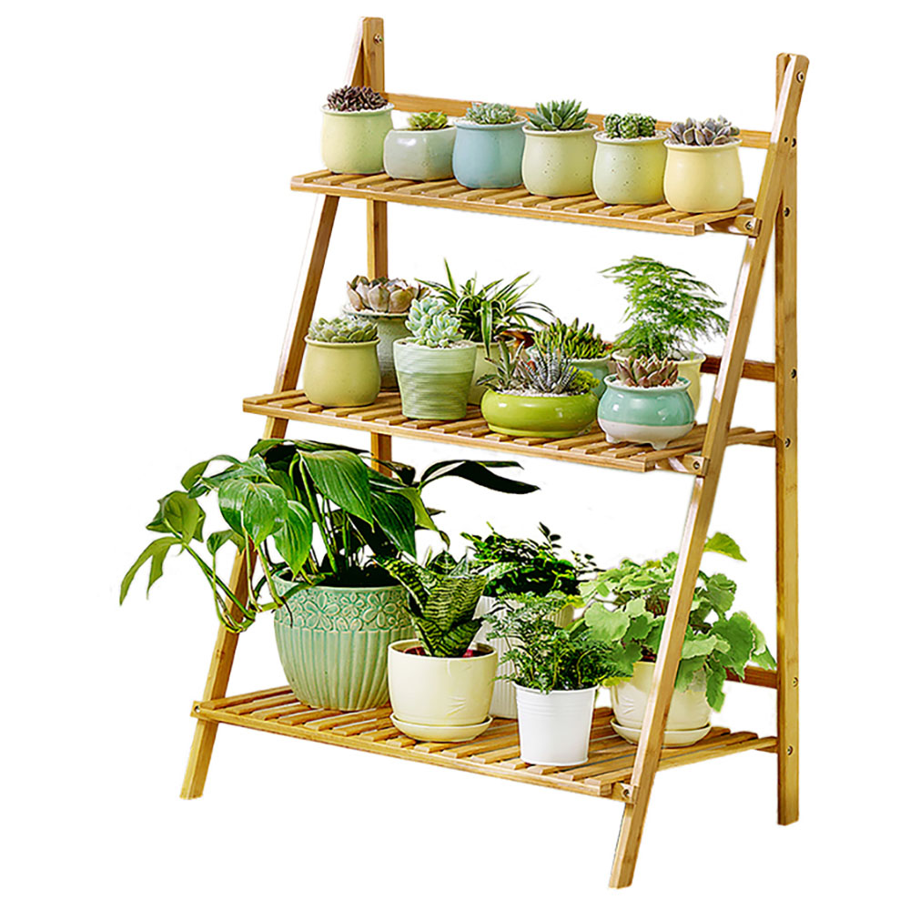 Organise in style with this Living and Home 3-Tier Wooden Foldable Natural Ladder Shelf. The foldable ladder shelf, made from lightweight wood, boasts its rustic finish, which goes well with most plants and blends with the hues of nature. The three-tier design display unit helps systematise things while maintaining a stylish appearance, and the natural wood colour matches most existing settings. Features a slated panel for convenient drainage, making the storage and rearrangement process uncomplicated and painless. Apart from plant shelving, it can also be a bedroom organiser or a display shelf in the drawing room. Suitable for indoor and outdoor areas. Dimensions: H96 x L70 x W40cm.