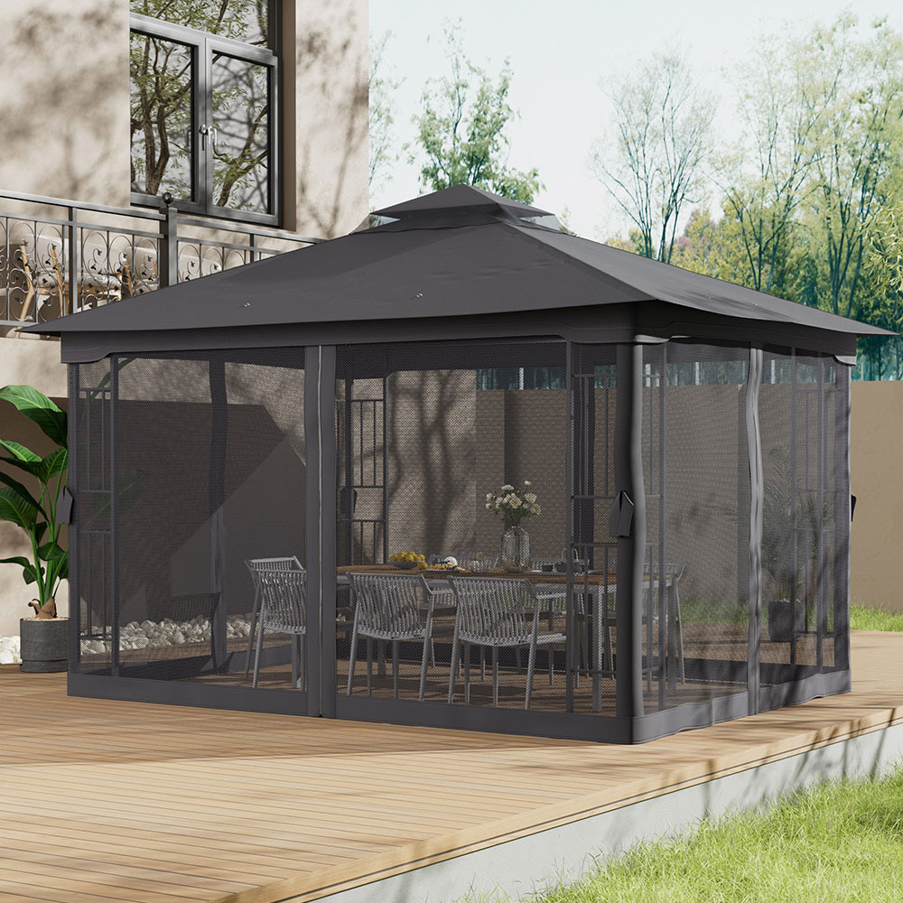 Before the hot summer sun shines, set up this gazebo to block the sun's fierce attack. With vents on the top and thin, flowing curtains around, air can flow freely, so you will not feel stuffy. The canopy is made of thick polyester that is both waterproof and UV-resistant, paired with a sturdy metal frame, the gazebo is stable to withstand all kinds of weather conditions. Your furniture can stay well protected from UV rays and rain under the gazebo. Enjoy a pleasant and cool outdoor party with this amazing gazebo!
