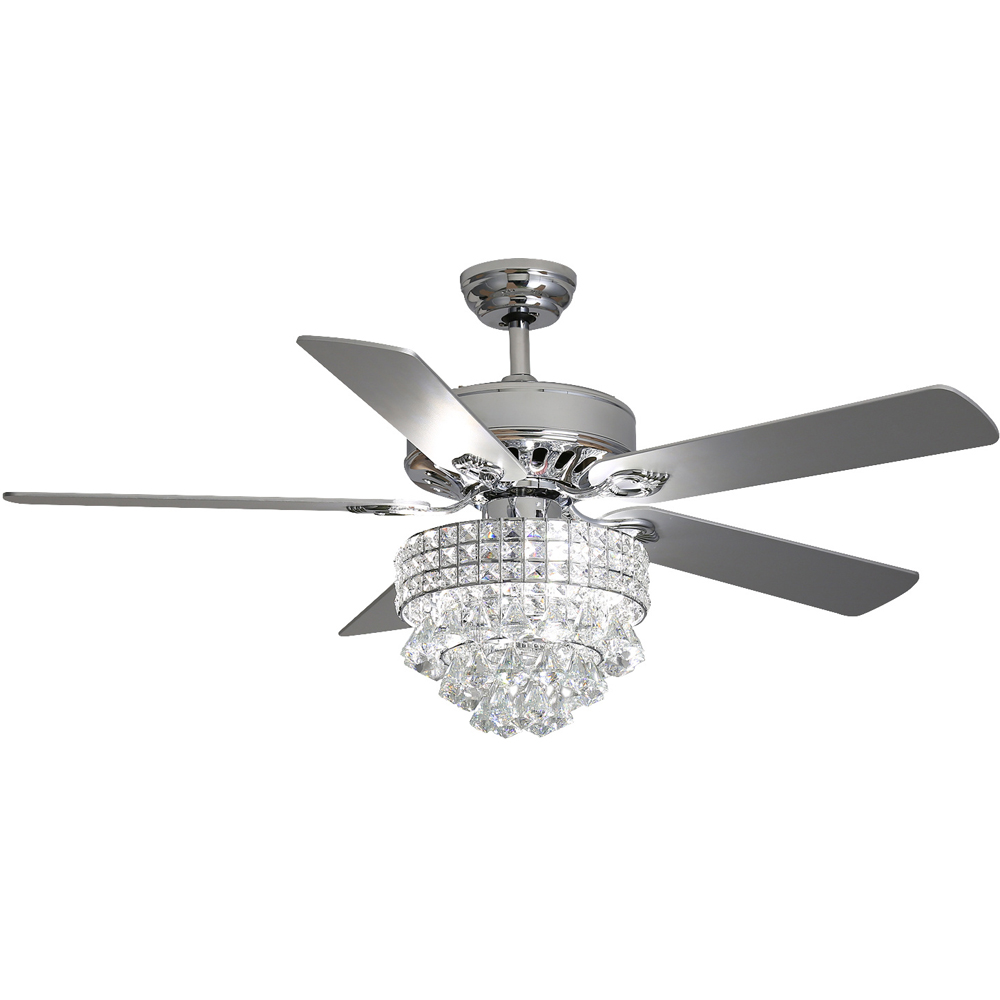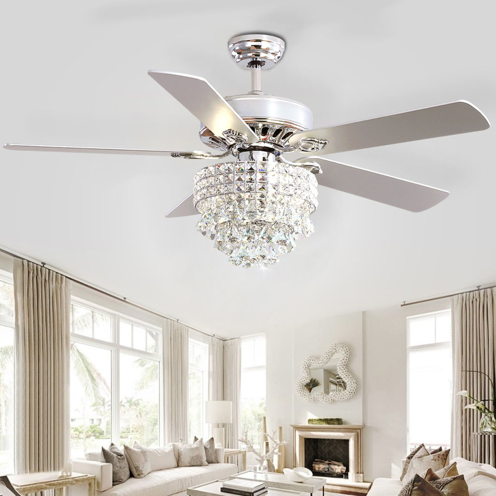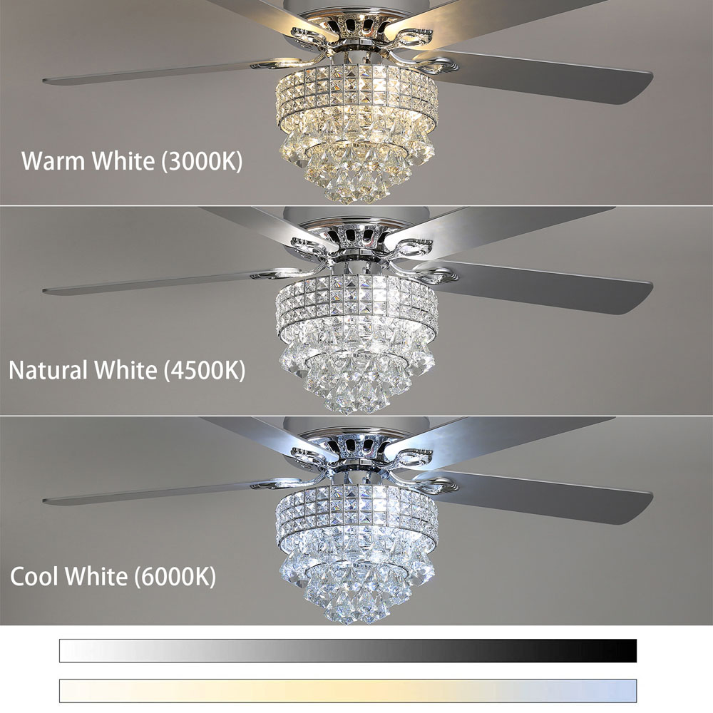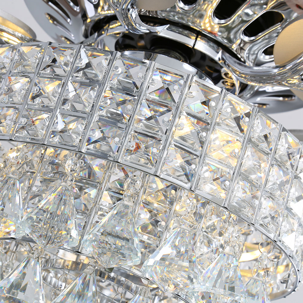 This crystal fan light is an evolution of appearance and function. It will offer you an amazing user experience that's beyond your expectation. As beautiful as it is functional, this 52-inch contemporary ceiling fan features 5 glossy metallic blades, and the three-speed motor provides year-round service. Charming rhinestones and hanging crystal elements, beautifully sparkle and reflect the light, adding romantic ambiance to your warm home. Whether you're looking for a way to cool down yourself during hot weather, or want to light up your home, this ceiling fan light will fulfil your needs.