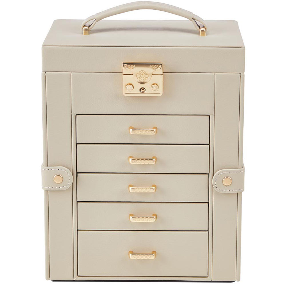 Enhance your jewellery storage with this elegant jewellery box, featuring a refined leather exterior and a soft light pink lining. The gold lock and handle add a touch of sophistication, while the top layer offers slots for rings and earrings, along with two side compartments for necklaces. A mirror on the lid allows for convenient accessorizing. The drawer below includes built-in compartments, ensuring all your precious pieces are organized and easily accessible.
