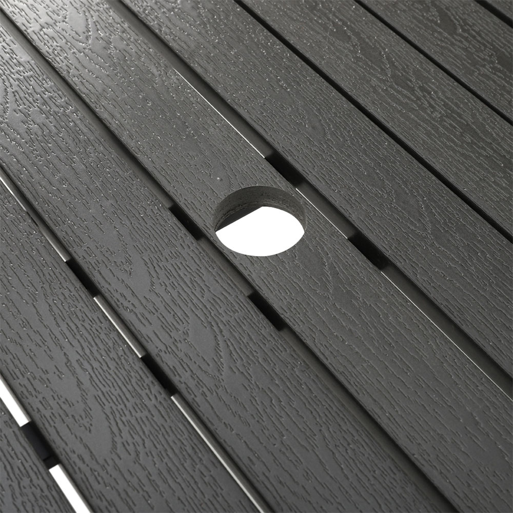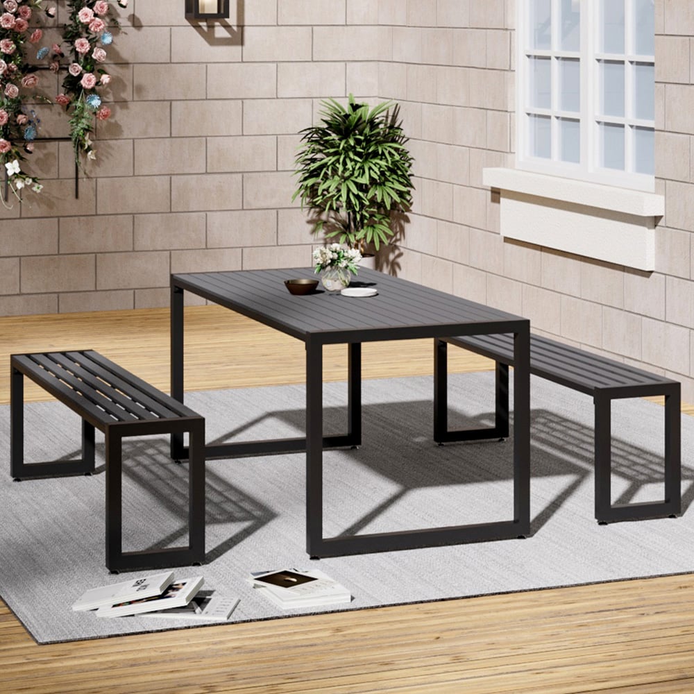 This table and benches set combines both modern and traditional styles with WPC tops and metal frames. This set contains a pair of benches and a rectangular table that is designed for gathering with friends and family to spend the weekends. Best of all, this set can withstand both sunny and rainy days since there’s a hole in the middle where you can insert a parasol. It is the perfect addition to your garden. Note: Two packages may arrive at different times.