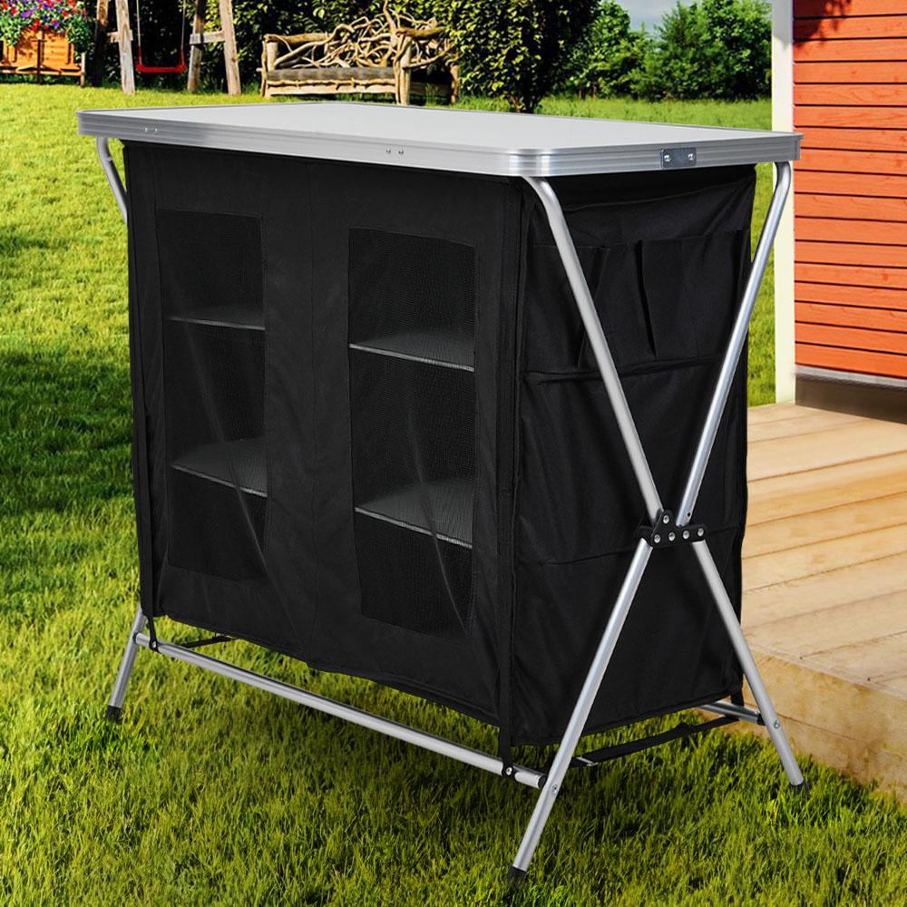 Effortlessly create the perfect outdoor kitchen with the Living and Home 6 Tier Portable Aluminium Camping Table. This portable outdoor cabinet is designed for camping or dining, with a sturdy aluminium frame and spacious storage. It features a white and easy-to-clean tabletop, perfect for food prep or serving. The cabinet is equipped with black fabric doors that cover multiple shelves, providing organised storage for your camping essentials or kitchenware. The breathable mesh windows allow for ventilation while keeping your items secure. The lightweight design and foldable construction make it easy to set up and transport, offering both convenience and practicality for your outdoor adventures. Overall Dimensions: H88 x W100 x D50cm. Weight: 4kg. Material: MDF, nylon cloth. Frame material: Aluminium alloy.