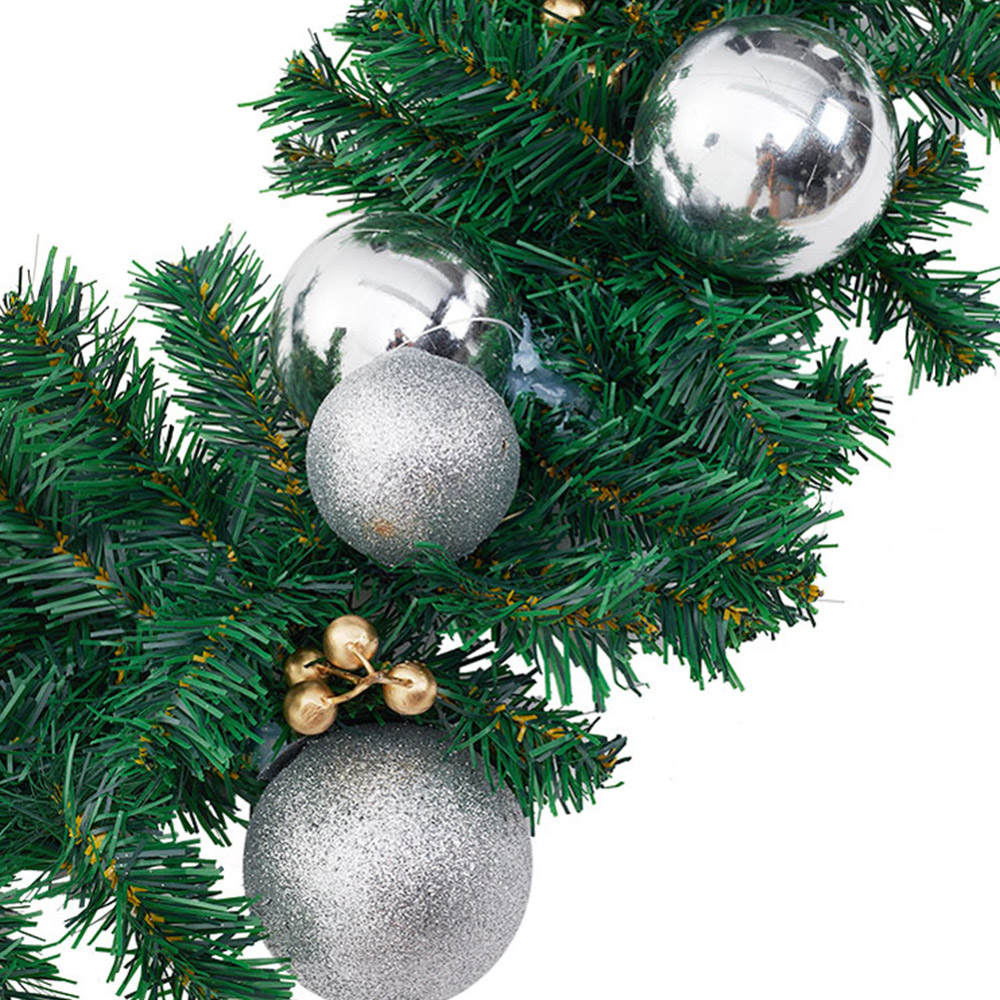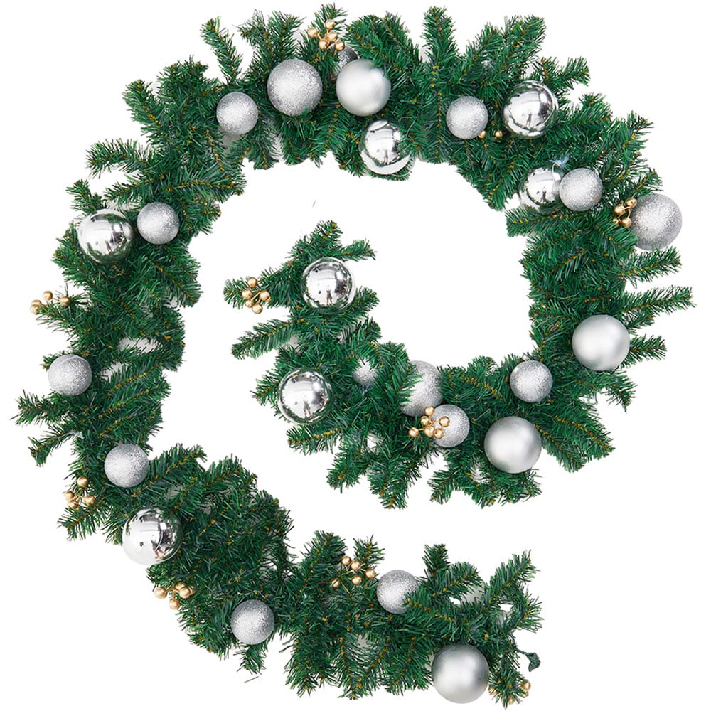 Create a stunning festive backdrop with the Living and Home Artificial Plastic Pine Christmas Garland 270cm. This nine feet long garland features full, lush pine needles in a rich green, creating a realistic and vibrant look. It is beautifully decorated with gold berries and silver baubles that add a festive touch. This garland is perfect for a variety of spaces as it can be draped over doors, windows, fireplace mantels, fences, or stairway railings. Crafted from durable plastic material, it is designed for long-lasting use and can be enjoyed year after year. The combination of realistic pine needles and shimmering decorations makes it a charming addition to any holiday setting.
