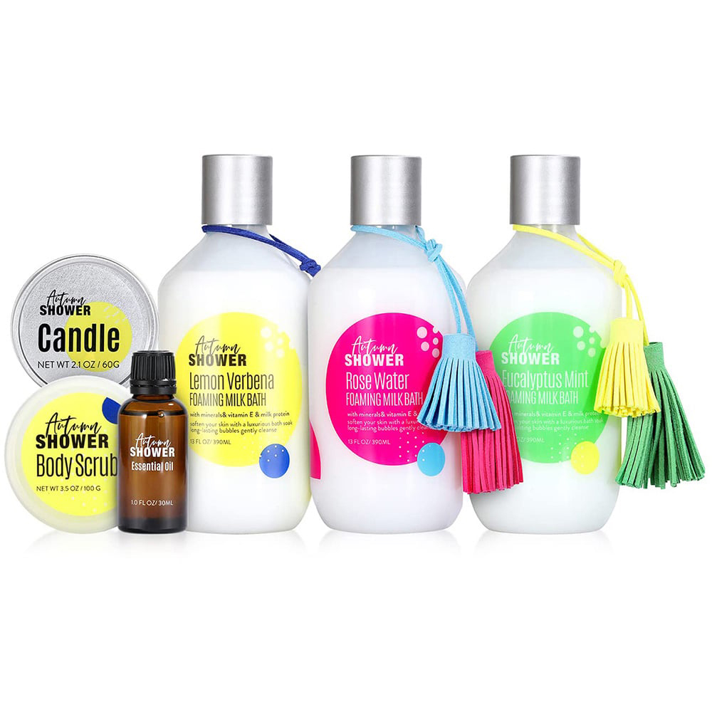 Experience the ultimate luxury with the Living and Home Autumn Shower Foaming Bubble Bath Gift Set 6 Piece. This bath gift set creates a rich, fragrant oasis in warm water. It indulges in scents like rose, lemon, verbena, and eucalyptus, while Epsom salts and essential oils pamper your skin. This gift set is also suitable for all skin types and perfect for any occasion. It also blends coconut, shea butter, aloe, and vitamin E for velvety skin.
