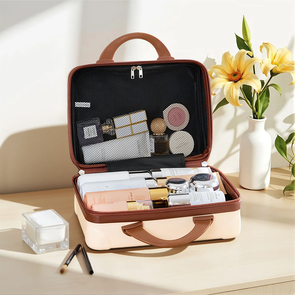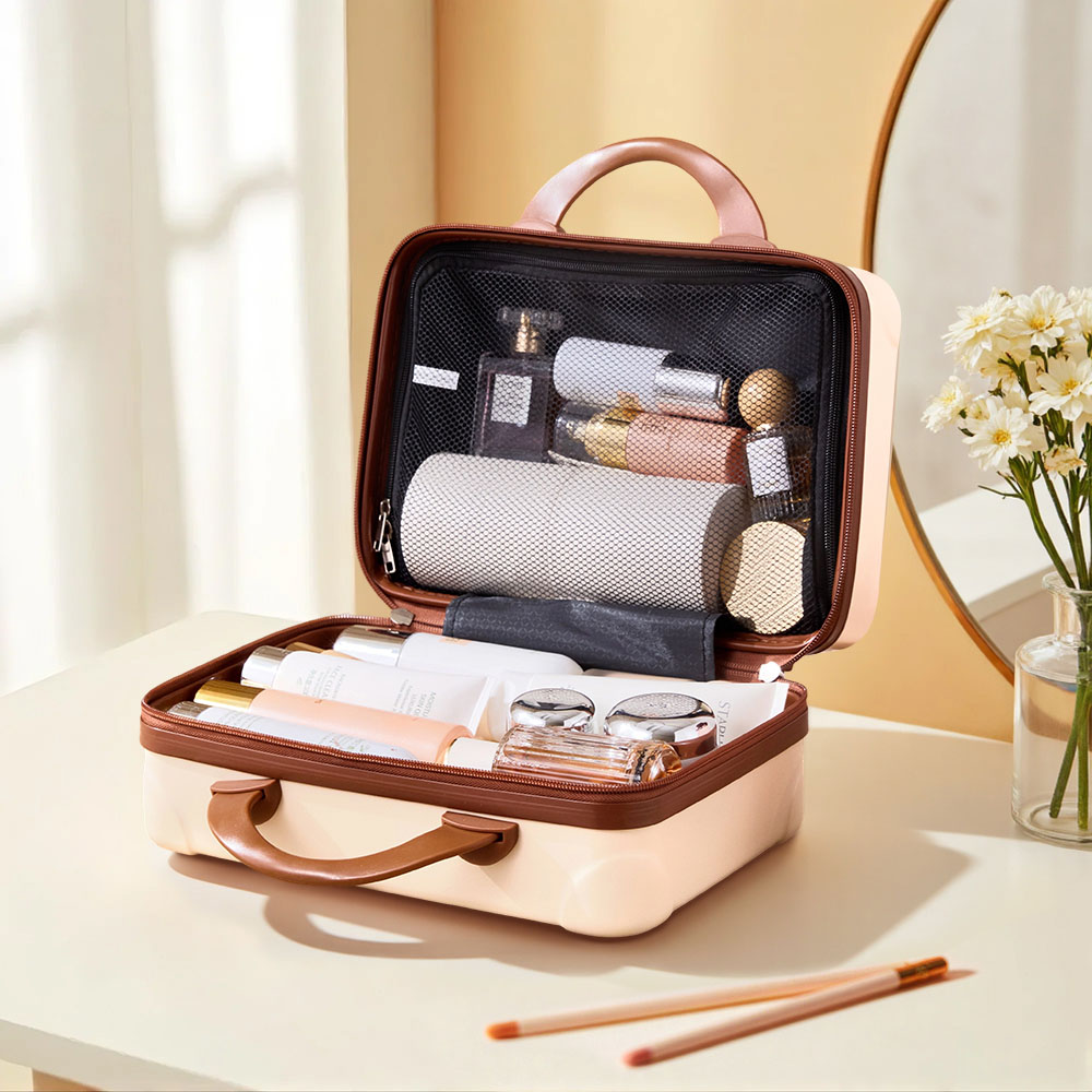 Step out in style and keep your beauty must-haves perfectly organised with a beige hard shell cosmetic travel case that features compartments and a compact twenty-eight centimetre size, making it an ideal portable handheld makeup storage box for travel. Enjoy peace of mind with a sturdy ABS shell that shields your essentials from bumps and moisture, while a soft polyester lining and zippered mesh compartment ensure everything stays secure and clutter-free. The modern beige design pairs effortlessly with any luggage and scratch-resistant feet help protect the shell, so you can rely on it for trips or daily routines.