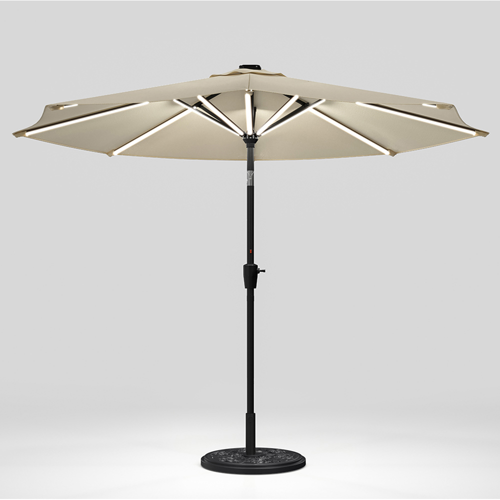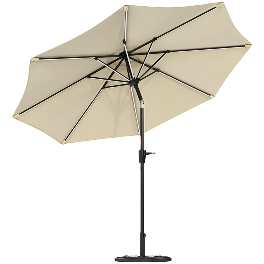 This umbrella exudes a sense of holiday relaxation, sure to evoke memories of the best vacations. Pleasing to the eye and easy to use, it features a convenient crank lift for easy opening and closing. The manual tilt allows for angle adjustments, creating the ideal shade against the sun and wind. With built-in LED strips, this umbrella transforms at night, creating a dreamy atmosphere that enhances any outdoor environment. Better yet, this set contains a base that is not only good-looking but also supportive.