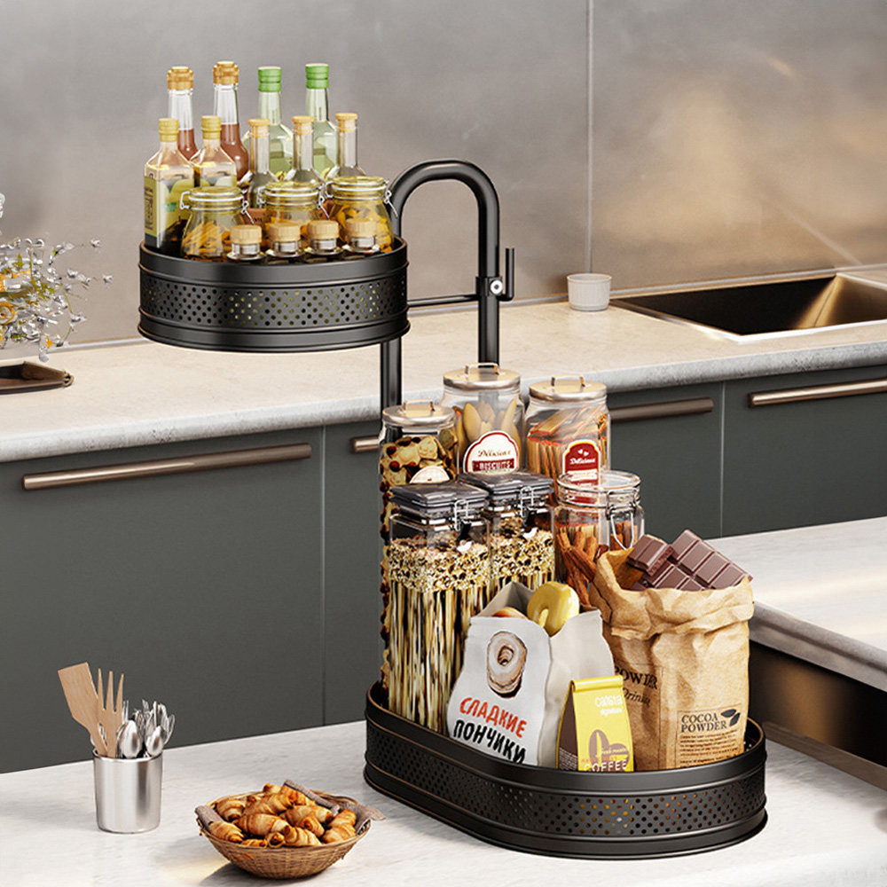 This rotating spice rack features two tiers of baskets, with a sturdy metal frame and non-slip feet to keep your items safe and secure. The upper basket is designed to rotate smoothly, allowing you to easily access your spices and other items without having to move everything around. This storage rack is great for saving space on your countertop. Plus, its stylish design adds a touch of elegance to your kitchen decor.