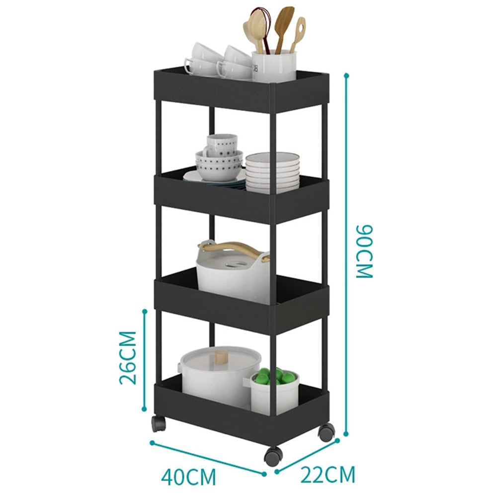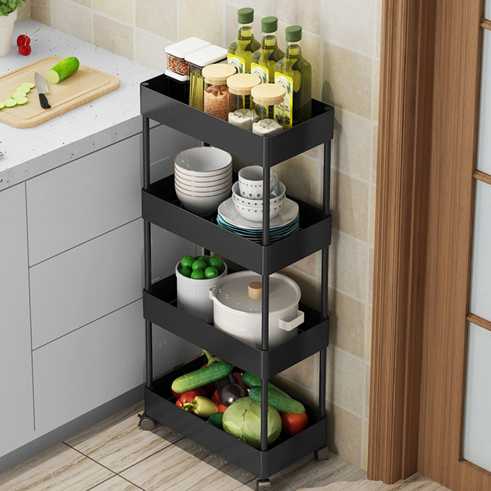 Experience ultimate convenience and organization with the Living and Home 4-Tier Trolley for Kitchen and Bathroom. This versatile mobile shelving unit is designed to fit in any space, whether it's your kitchen, bedroom, bathroom, laundry room, or more. Made from high-quality ABS material, it offers durability and resistance to rust and breakage, ensuring long-lasting use. The hollow carved design of the trolley keeps it from water accumulation, making it suitable for various environments. Equipped with four easy-glide, durable wheels and an ergonomic handle, this storage cart can be effortlessly pulled in and out of narrow spaces, providing you with easy access to your stored items. The multi-tier design of this trolley maximizes your storage options, helping you solve all your storage problems and keep everything organized. The adjustable shelves allow for flexible placement on countertops, accommodating your specific needs. It offers a space-saving and versatile storage solution. Invest in this easy-to-assemble and practical storage cart to create a clean and comfortable home environment. Size: 40 x 22 x 90cm.