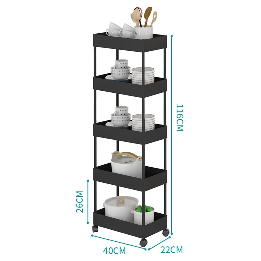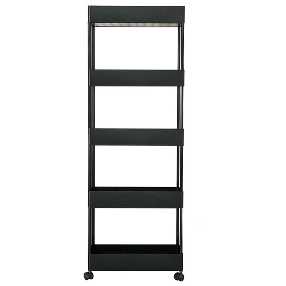 Experience ultimate convenience and organization with the Living and Home 5-Tier Black Trolley for Kitchen and Bathroom. This versatile mobile shelving unit is designed to fit in any space, whether it's your kitchen, bedroom, bathroom, laundry room, or more. Made from high-quality ABS material, it offers durability and resistance to rust and breakage, ensuring long-lasting use. The hollow carved design of the trolley keeps it from water accumulation, making it suitable for various environments. Equipped with four easy-glide, durable wheels and an ergonomic handle, this storage cart can be effortlessly pulled in and out of narrow spaces, providing you with easy access to your stored items. The multi-tier design of this trolley maximizes your storage options, helping you solve all your storage problems and keep everything organized. The adjustable shelves allow for flexible placement on countertops, accommodating your specific needs. It offers a space-saving and versatile storage solution. Invest in this easy-to-assemble and practical storage cart to create a clean and comfortable home environment.