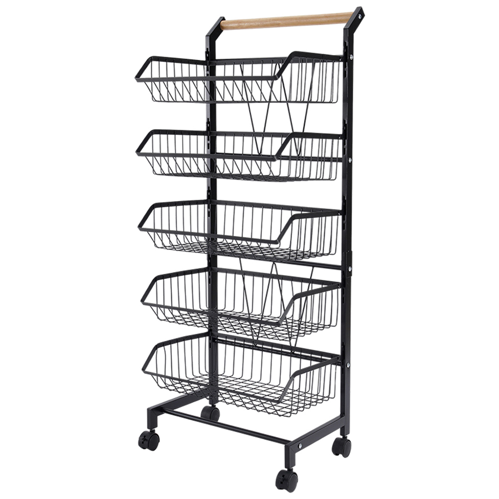 Keep your kitchen organised and clutter-free with this five-tier kitchen trolley. Crafted from high-quality carbon steel, it is built to last and can handle heavy loads without compromising its stability. It boasts ample storage space for all your kitchen essentials, ranging from fruits and vegetables to pantry items and cleaning supplies. Each basket layer is equipped with a drainage function, enabling rapid water runoff to ensure items remain dry. Additionally, the adjustable tier spacing allows you to customise the layout to accommodate items of various sizes, enhancing both functionality and convenience. Dimensions: H105 x W42 x D32cm.
