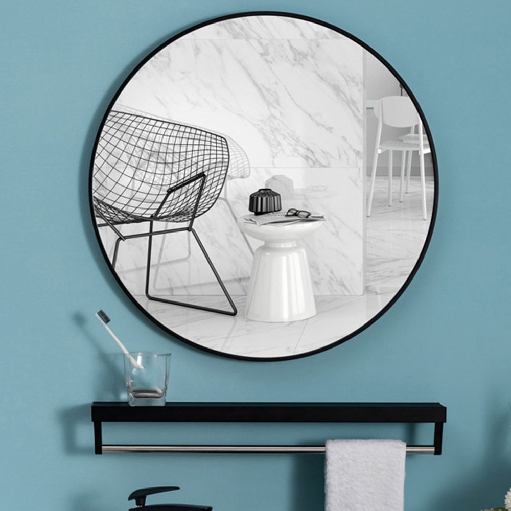 Inject style and function in your living space with this Living and Home Nordic Wall Hanging Black Round Framed Bathroom Mirror 40cm. Features a sleek and slender round metal frame with a minimalist style, making it ideal for hanging up in modern-style bathrooms and hallways. A simple yet classically designed mirror, perfect for quick check-ups before you leave the house. The extra-large-sized mirror has a fast defogging quality to provide precise imaging and is covered with an anti-explosion film.
