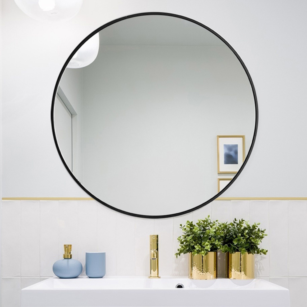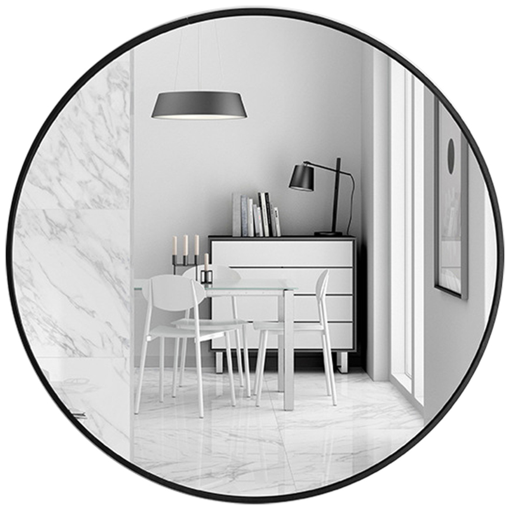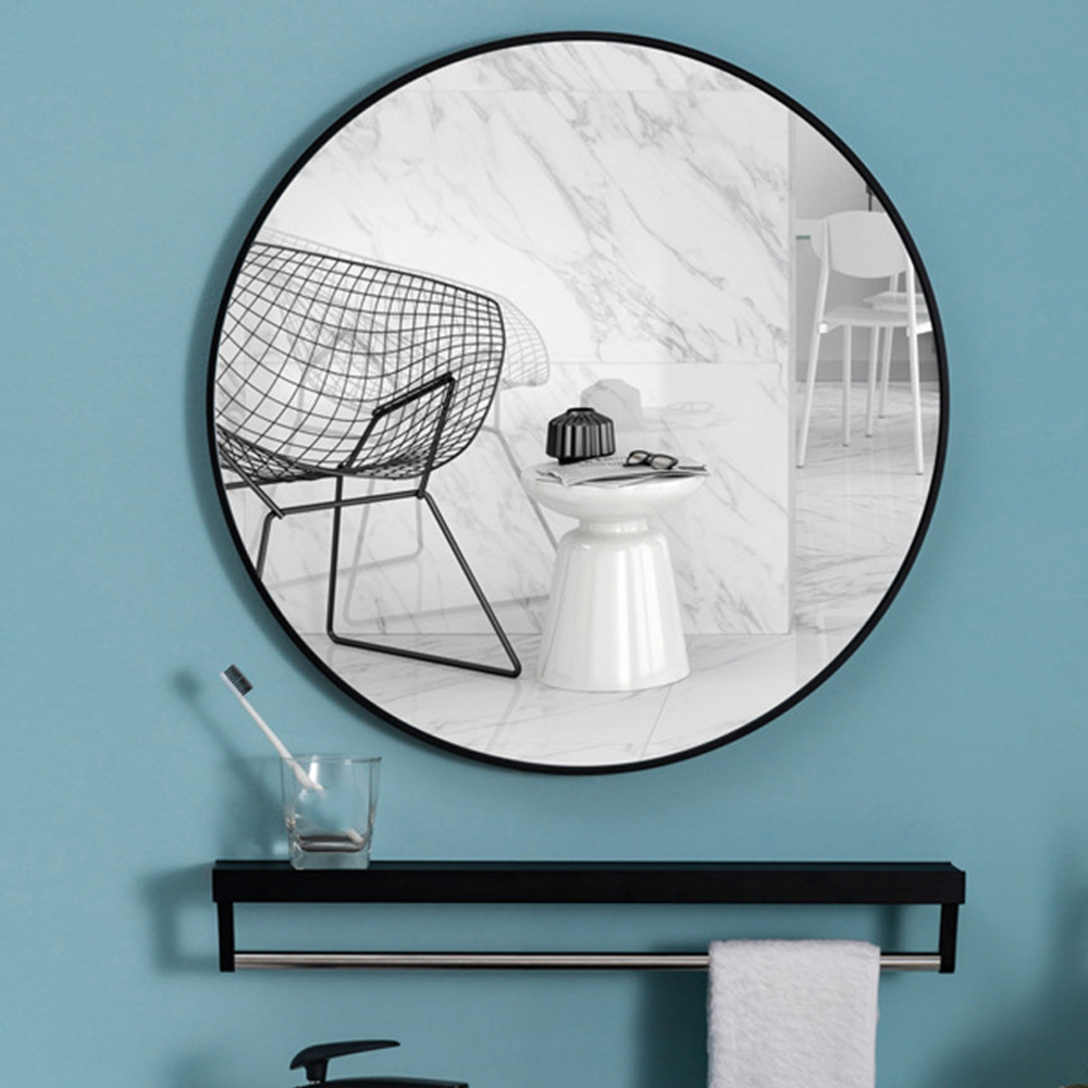 Inject style and function in your living space with this Living and Home Nordic Wall Hanging Black Round Framed Bathroom Mirror 80cm. Features a sleek and slender round metal frame with a minimalist style, making it ideal for hanging up in modern-style bathrooms and hallways. A simple yet classically designed mirror, perfect for quick check-ups before you leave the house. The extra-large-sized mirror has a fast defogging quality to provide precise imaging and is covered with an anti-explosion film.