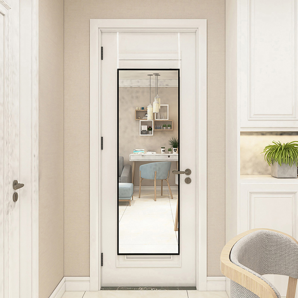 Elevate your baths with this Living and Home Over Door Full Length Mirror. The slender and clean frame in a stylish black finish of this full-length mirror highlights the glamour of simplicity. To add versatility, the mirror provides multiple ways to reflect your beauty. If your room space is a bit limited, you can use the metal hook to hang it on your door. Also, if your wall is too plain, you can use the stickers to mount it on the wall. Apart from this, if you prefer a more casual way, just simply lean it against the wall. Size: 28 x 78cm.