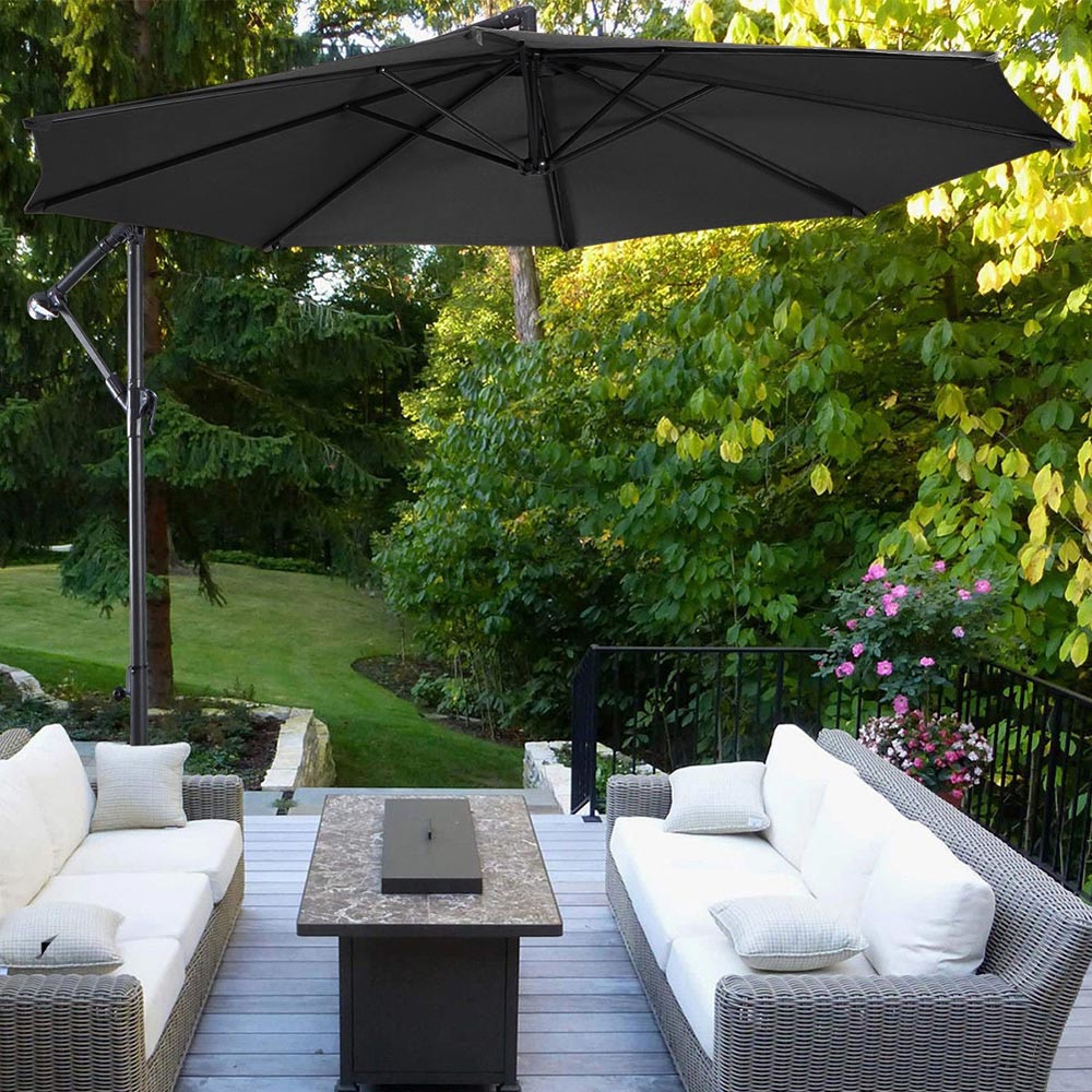 Add a stylish and comfortable touch to your outdoor space with this Livingandhome 3m Black Garden Cantilever Parasol with Round Base. With this lovely parasol, you can enjoy a comfortable time in your garden. Sturdy and safe, the shade is waterproof and UV-resistant, and it not only provides shelter for you when it rains but also keeps you cool under the hot sun. Featuring high-quality 180g polyester fabrics with top vents and an optional base, this parasol makes a perfect addition to your garden areas. Easy to use, simply lift the slider to extend your parasol outward. Also, with a 3-metre diameter, this hanging garden parasol effortlessly hangs over your dining set or garden setting. Apart from this, it perfectly complements your rattan furniture or outdoor dining table. For added convenience, it includes a crank-winding mechanism to open and close the parasol without hassle. Additionally, the inclination angle of the umbrella is adjustable for maximum ease. Material: 8 ribs, 48/42mm metal pole, 180g polyester fabric cover. Pole: 48 x 1mm. Base: 100cm diameter. Size: 3 x 2.6m. Looking for a way to keep your parasol secure and protected and enjoy some shade? Check out our selection of