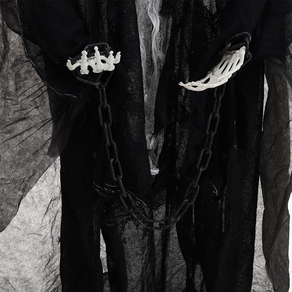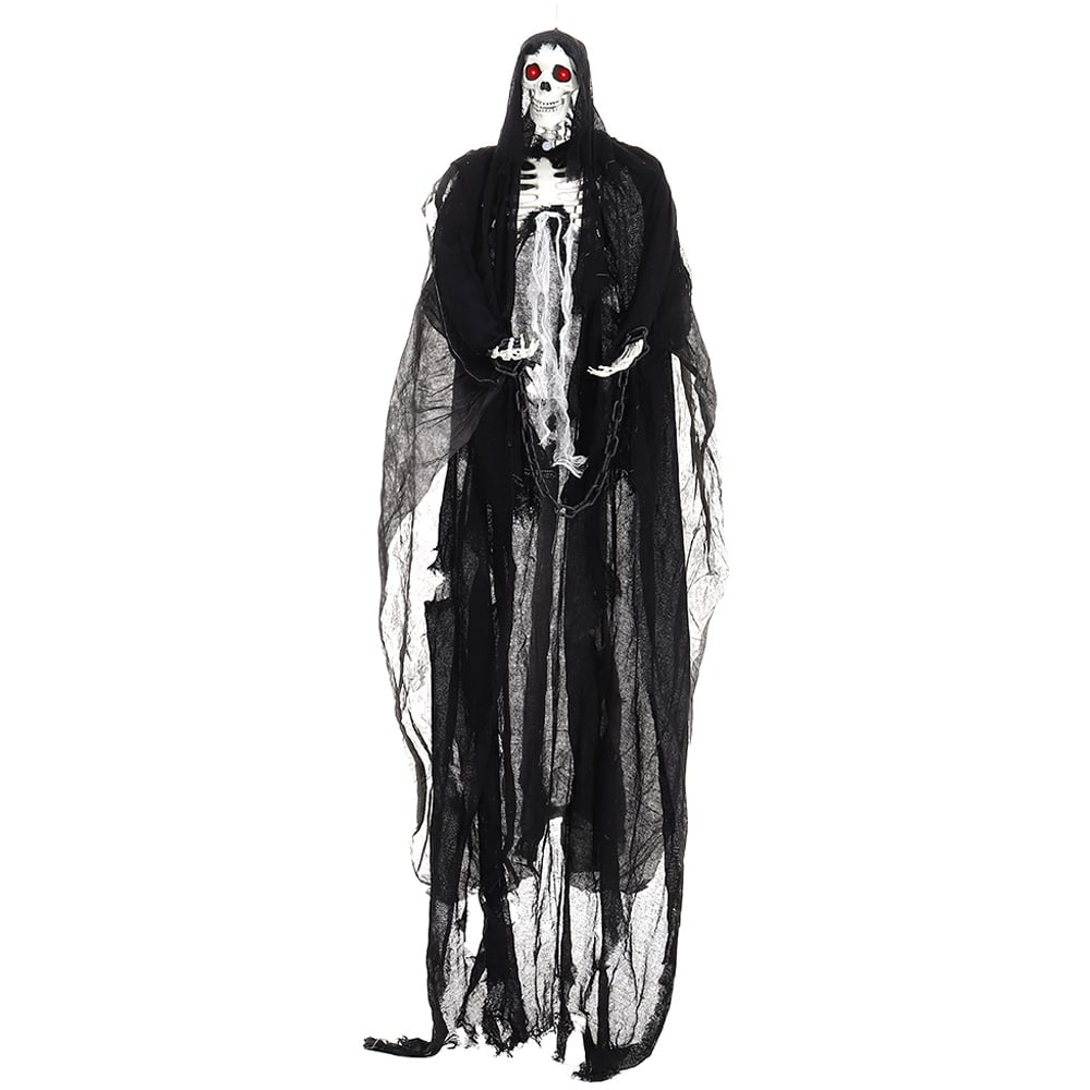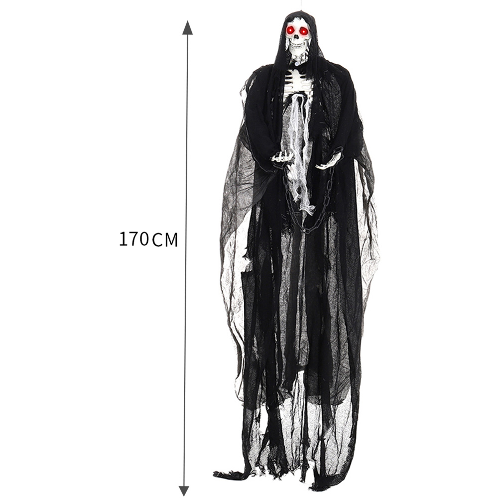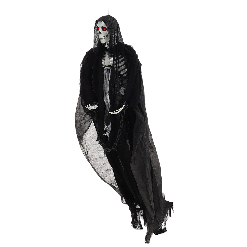Add a chill to your Halloween celebrations with the Living and Home Black Halloween Hanging Skeleton Ghost with Motion Sensor 170cm. This Halloween decor is dressed in spooky attire and is holding onto chains. It's carefully made from high-quality materials, so it's not only long-lasting but can also be used again and again. As people approach, the skeleton's eyes light up in a bone-chilling red glow, accompanied by an spooky sound that will give you goosebumps. This fun decoration adds a touch of Halloween spirit and creates a spooky atmosphere at any gathering. Plus, thanks to its lightweight design, it can be easily hung up using the attached string. Dimensions: 170 x 55 x 55cm.