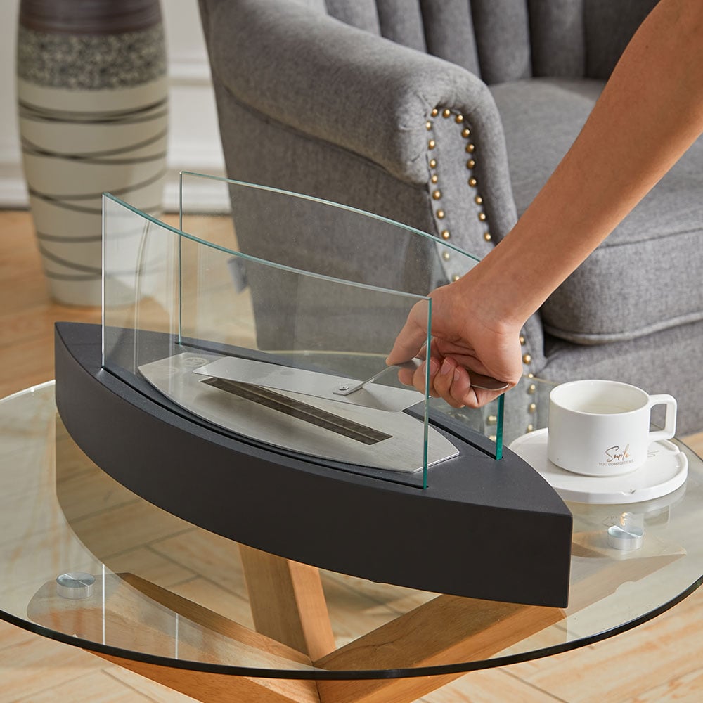 Bring a touch of elegance to your living space with this exquisite tabletop fireplace, guaranteed to captivate attention and spark conversations. With its sleek, curved design crafted from premium stainless steel and tempered glass, this fireplace is both functional and visually stunning. Enjoy an eco-friendly and efficient way to warm your room while adding a modern flair to your decor.