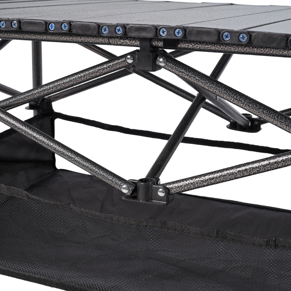 This portable folding camping table is a versatile and practical addition to any outdoor adventure. The roll-up tabletop is heat-resistant, rust-resistant, and easy to clean. Its lightweight and sturdy carbon steel frame with triangular structure ensures durability and strength, providing reliable support. The foldable design allows you to easily collapse into a compact size. Ideal for camping, picnics, tailgating, or any outdoor event, this table provides a reliable surface wherever you go. Moreover, it comes with a storage bag to store it in your car or camping gear without taking up too much space.