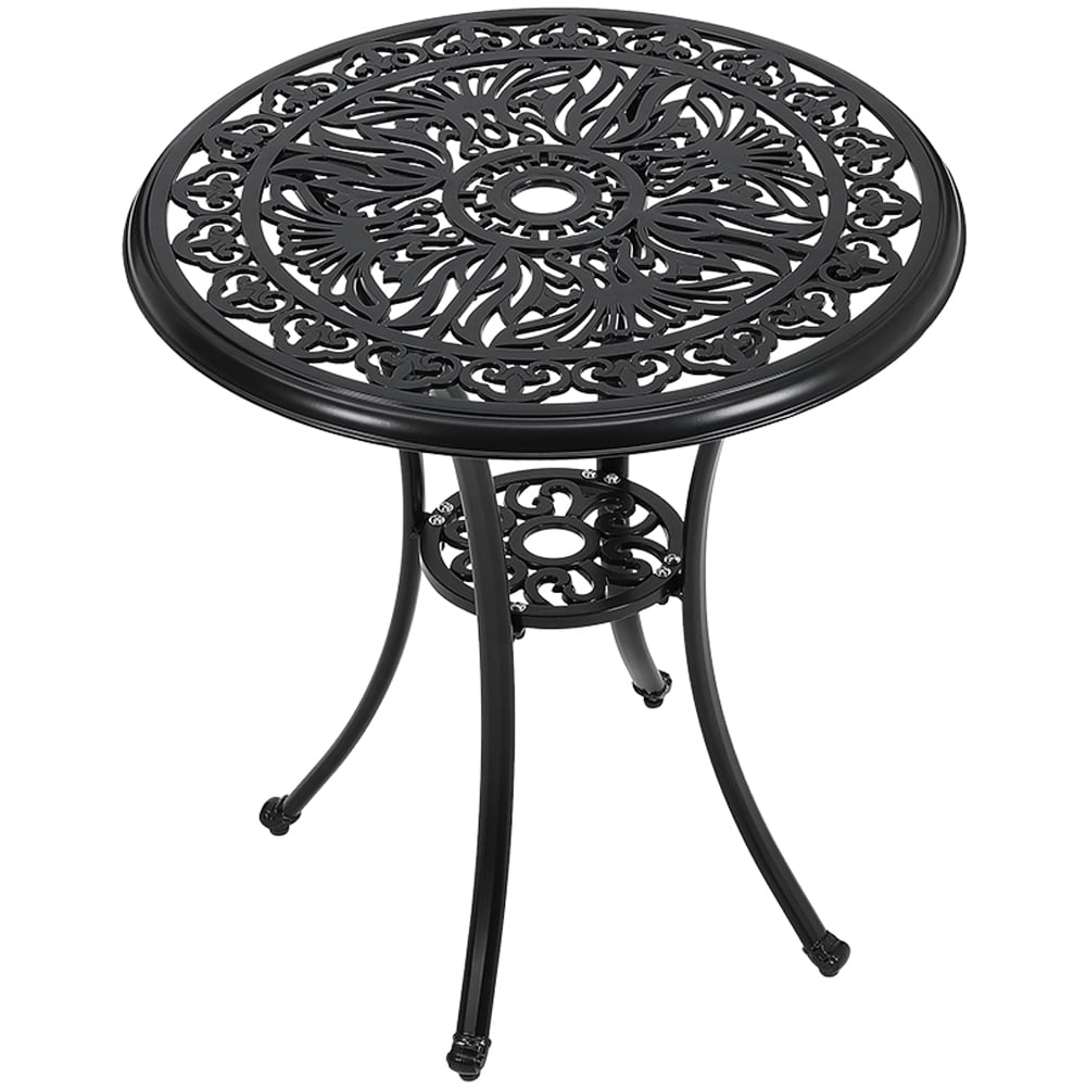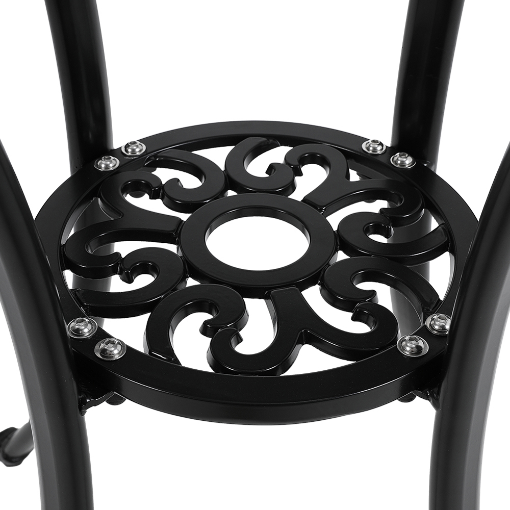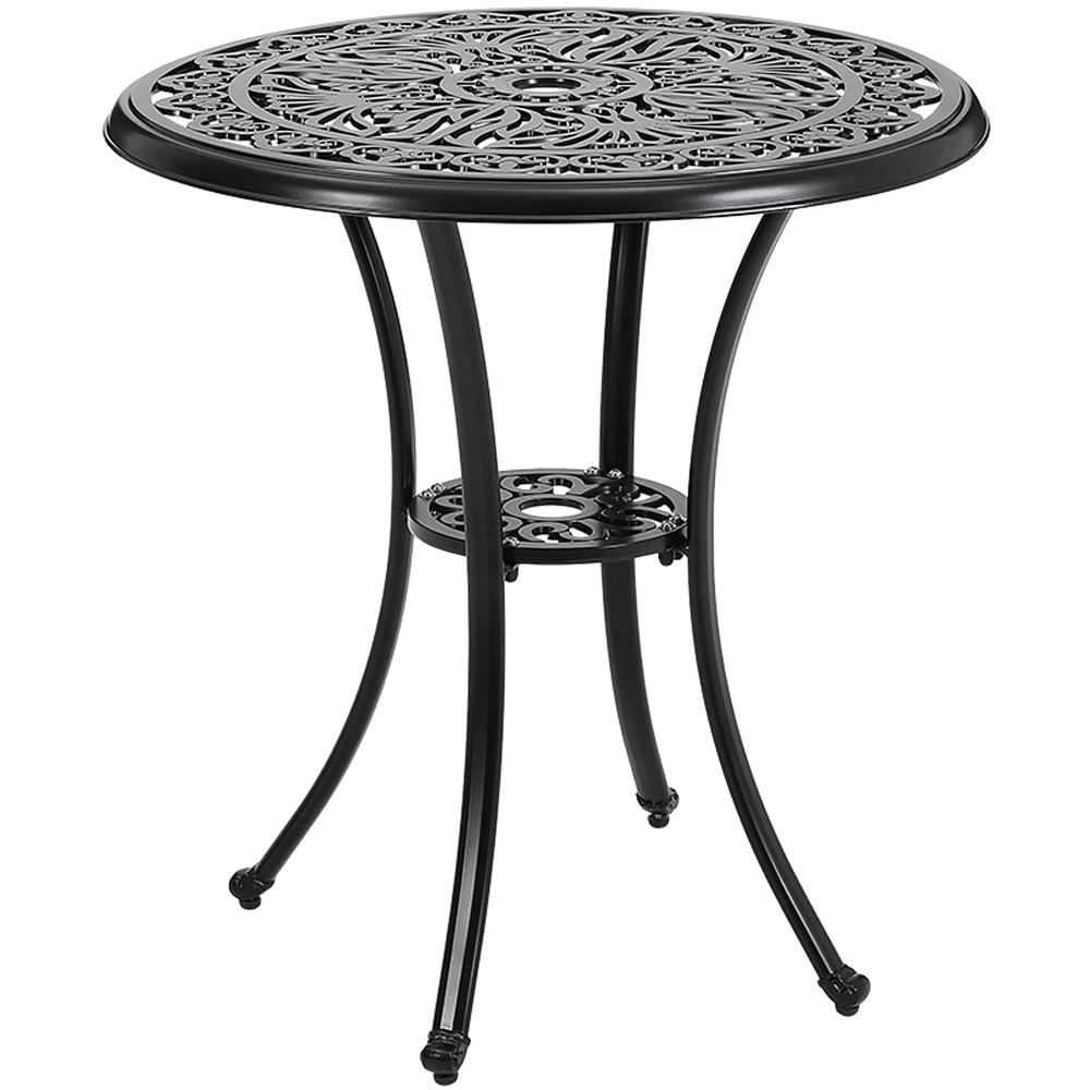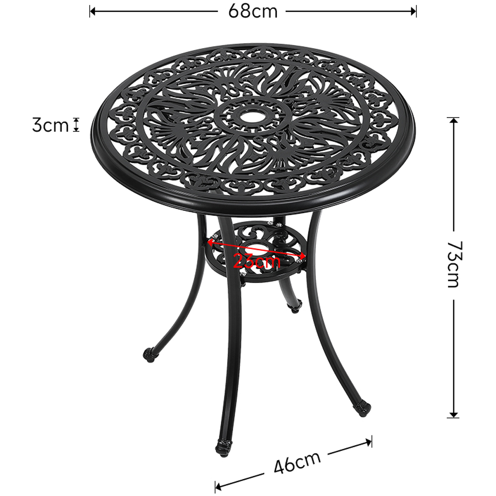 Enhance your dining area with the Living and Home Black Round Patio Dining Table with Umbrella Hole. It is crafted from strong, lightweight and weather-resistant cast aluminium with a rustproof black finish. It features a classic curved leg design and a decorative desktop. The table includes an umbrella hole in the centre. It accommodates most standard umbrellas to protect you from sun or rain while you dine. This beautiful and functional table is ideal for your patio or deck.