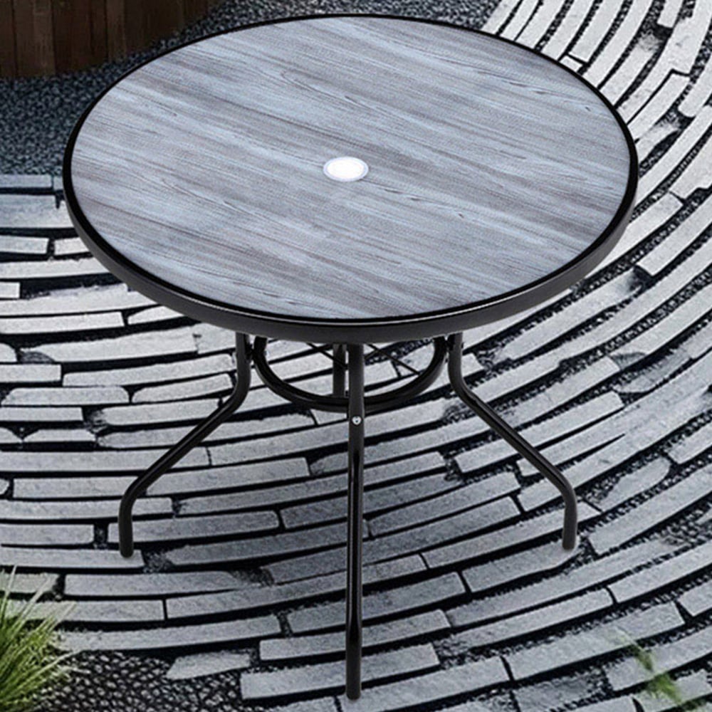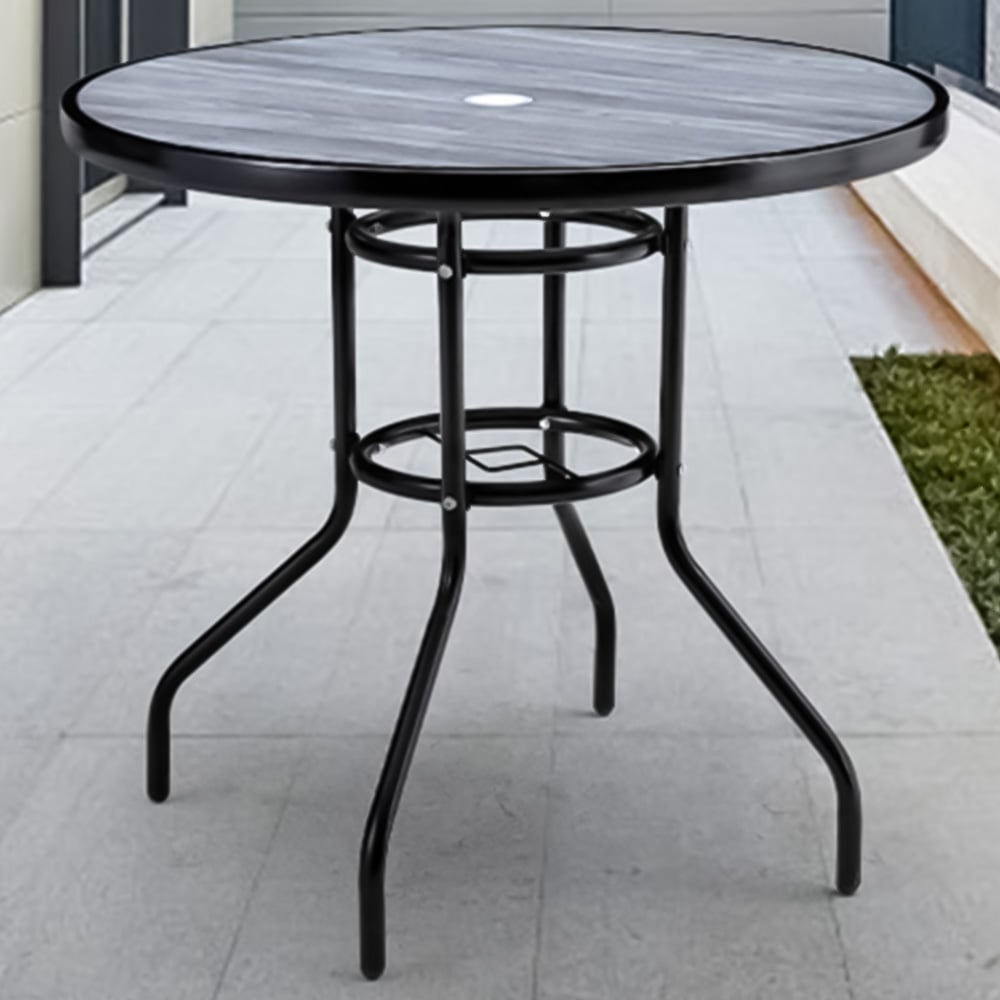 Add a touch of elegance in your outdoor space just like your indoor room with this Living and Home Black Tempered Glass Round Wood Grain Coffee Table. Crafted from durable tempered glass, this table has a smooth and strong surface. It has a natural wood texture underneath, complementing the transparent glass wall. The tabletop is framed by black metal, featuring a round shape to minimize the risk of bruises. It also features a built-in parasol hole, which provides convenient sun and rain protection. The sturdy and premium black base adds stability and a stylish accent. Dimensions: 80 x 73cm.
