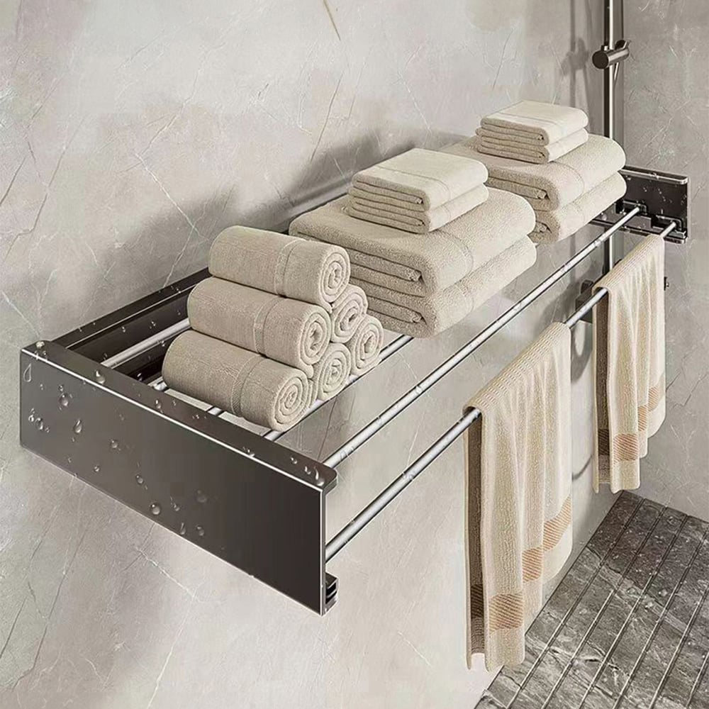 With clever use of space, this towel drying rack keeps your living environment in perfect order. Its layered design allows full use of space and effectively avoids moisture and bacterial growth by ensuring ventilation; when not in use, it can be neatly folded against the wall without taking up extra space. In addition, crafted from premium aluminium alloy, it is corrosion-resistant and rust-proof, ensuring that it is more durable and easy to maintain. It can also serve as a shelf to hold other household supplies such as bathrobes, bathroom accessories, kitchen supplies and so on. Therefore, it can be widely used in every corner of your home, making it an ideal choice for the efficient use of space in modern home life. This rack not only improves the living experience, but also shows the intelligence and convenience of modern design. Dimensions: 10 x 80 x 80cm.