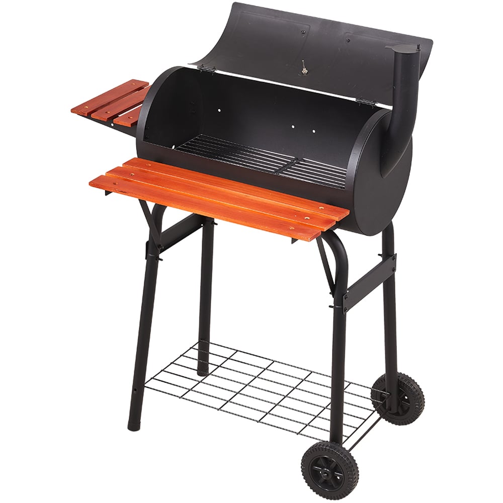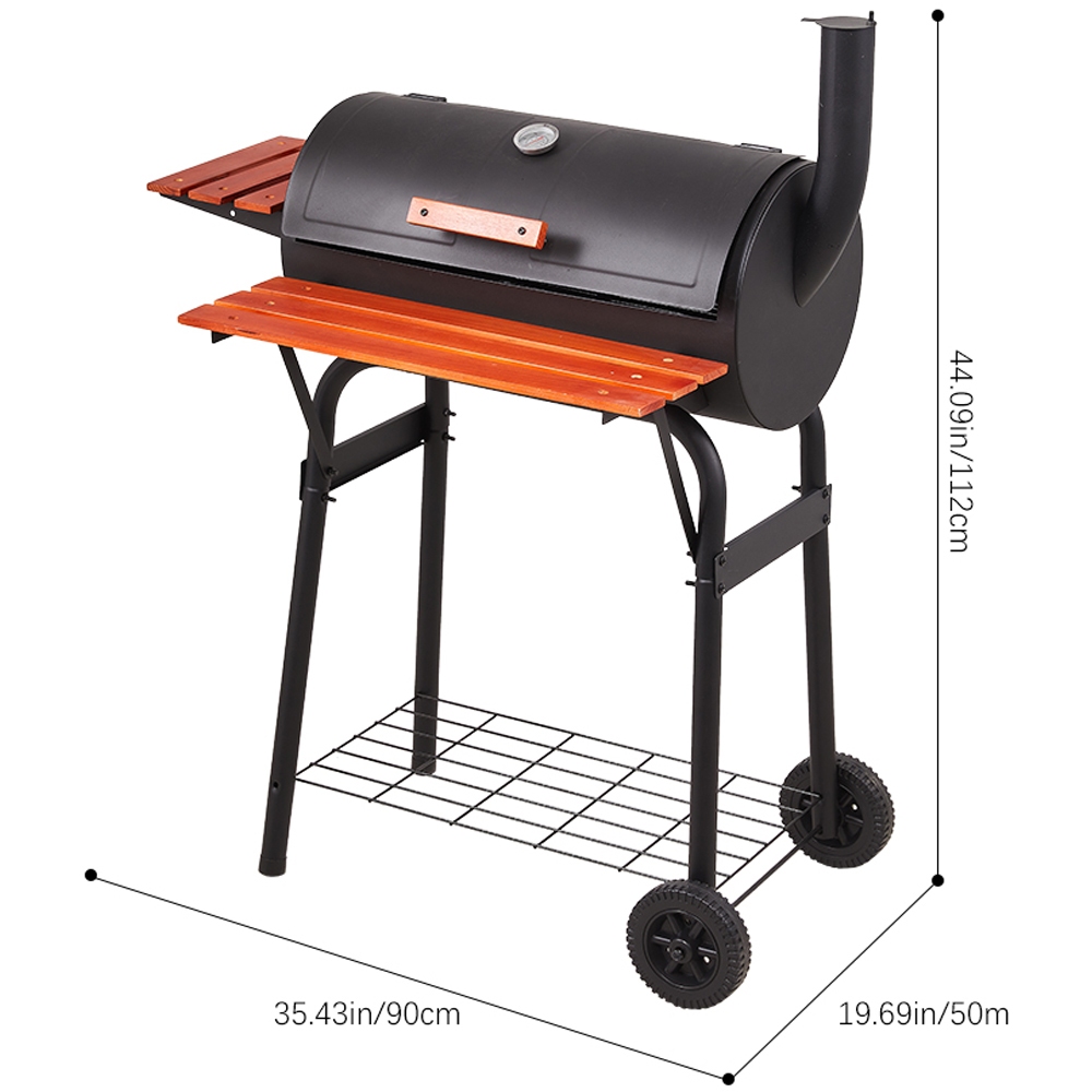 Upgrade your outdoor cooking experience with this versatile charcoal barbecue grill. Crafted from durable, powder-coated metal for enhanced rust resistance, it is perfect for smoking and advanced cooking. Its spacious, chrome-plated grill grate ensures even heat distribution, while the lid with a wooden handle allows safe, convenient use. Front and side wooden shelves, along with a bottom metal shelf, offer extra prep and storage space, making grilling effortless. Ideal for family gatherings and outdoor picnics.