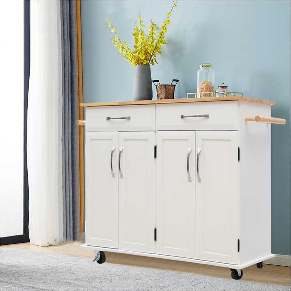 This Living and Home symmetric trolley cart is designed to push from both ways. Mainly made of high-quality Medium Density Fibreboard wood and a rubberwood tabletop, a strong and durable structure to meet daily use for sure. With ample storage space, this is a cart in line with home and business use. There are two cabinets and two drawers that can store fruits, vegetables, wine, kitchen supplies, and other daily necessities with good air tightness. Therefore, your stuff will be under great protection from bugs and dust. It can be used as an island within your kitchen or for added storage in the bathroom, dining room, garage, laundry room, nursery, or bedroom. It's simple and practical design can be easily integrated into various decoration styles. The modern and classic appearance makes it simple to pair with other furniture.
