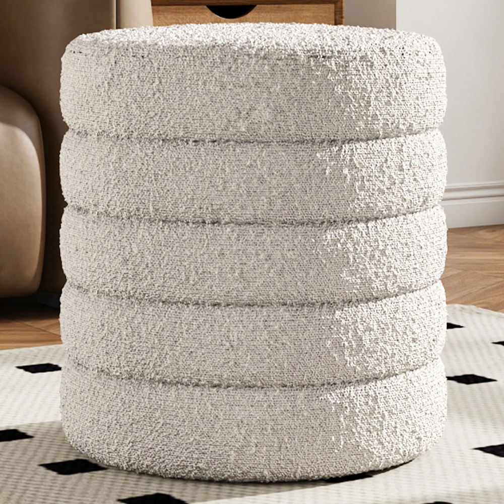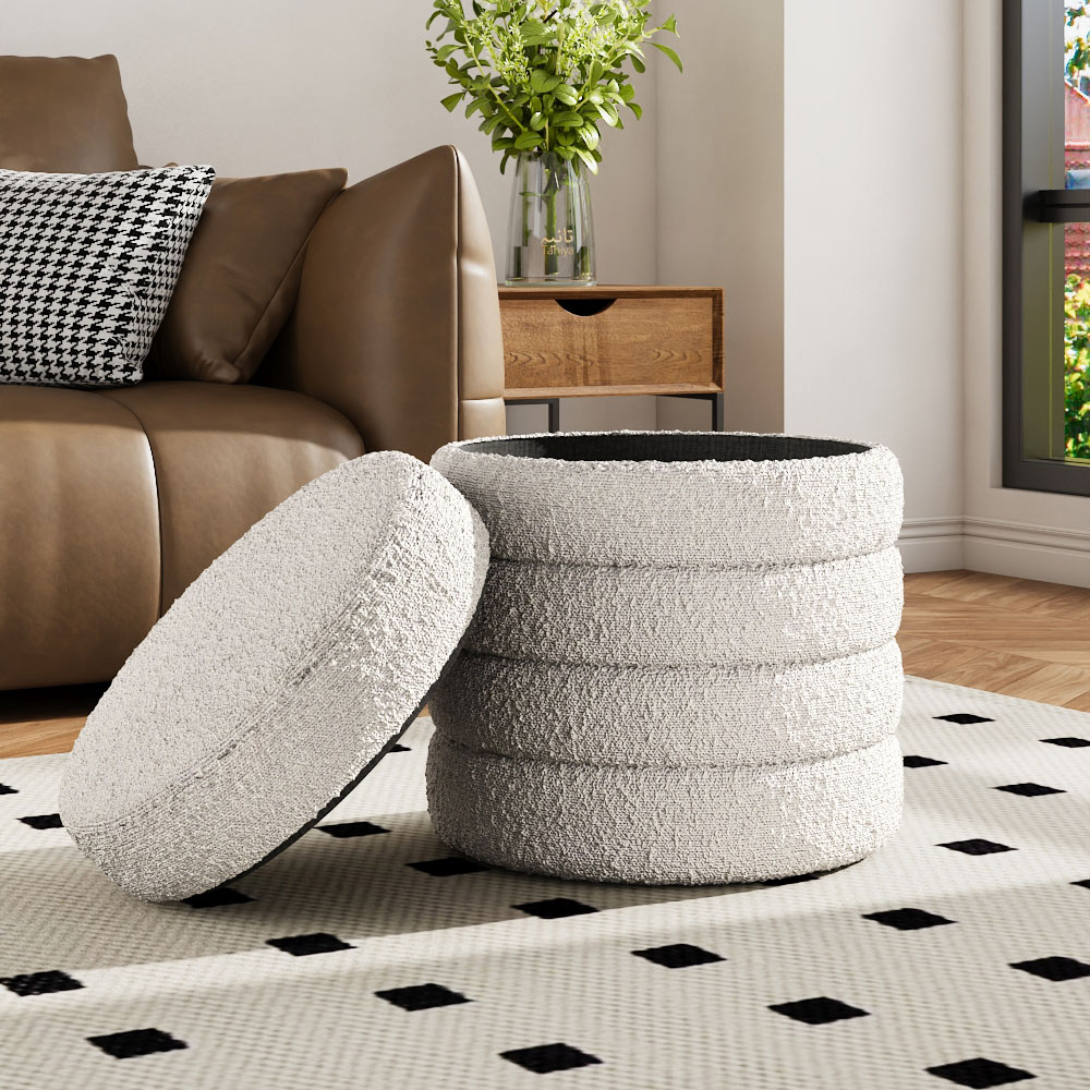 This versatile Cream Upholstered Tufted Round Storage Ottoman from Living and Home effortlessly combines style and practicality. Its compact size complements any decor, adding both charm and functionality to your space. The tufted surface and sponge upholstery provide a comfortable seating experience, while it can double as a makeup stool, a coffee table companion, or a storage spot for blankets and books in the living room. Whether you're relaxing or getting ready, this ottoman fits perfectly into any room. Upholstered in off-white particle velvet, it creates a warm, inviting atmosphere that enhances your living space. The durable wood frame and substantial weight capacity ensure long-lasting support, while the non-slip plastic legs keep it securely in place.