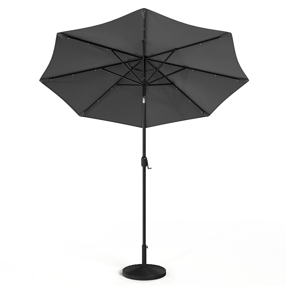 Enjoy your cuppa and evening meals on your patio under this 24 LED Garden Parasol Sun Umbrella from Living and Home. Featuring a large canopy that opens with a crank lift handle, this parasol provides proper shade. Made from high-quality polyester, the octagonal canopy in dark grey comes with eight ribs support and it works well with most outdoor settings. And when it starts to get dark, you can turn on the LED lights to add a romantic ambience. Powered by the solar panel at the top, there’s no need to worry about frequent charging. And, the included resin base can hold your parasol steadily no matter the weather. This umbrella is a wise choice if you want some shade and atmosphere at a time. Size: 3m.