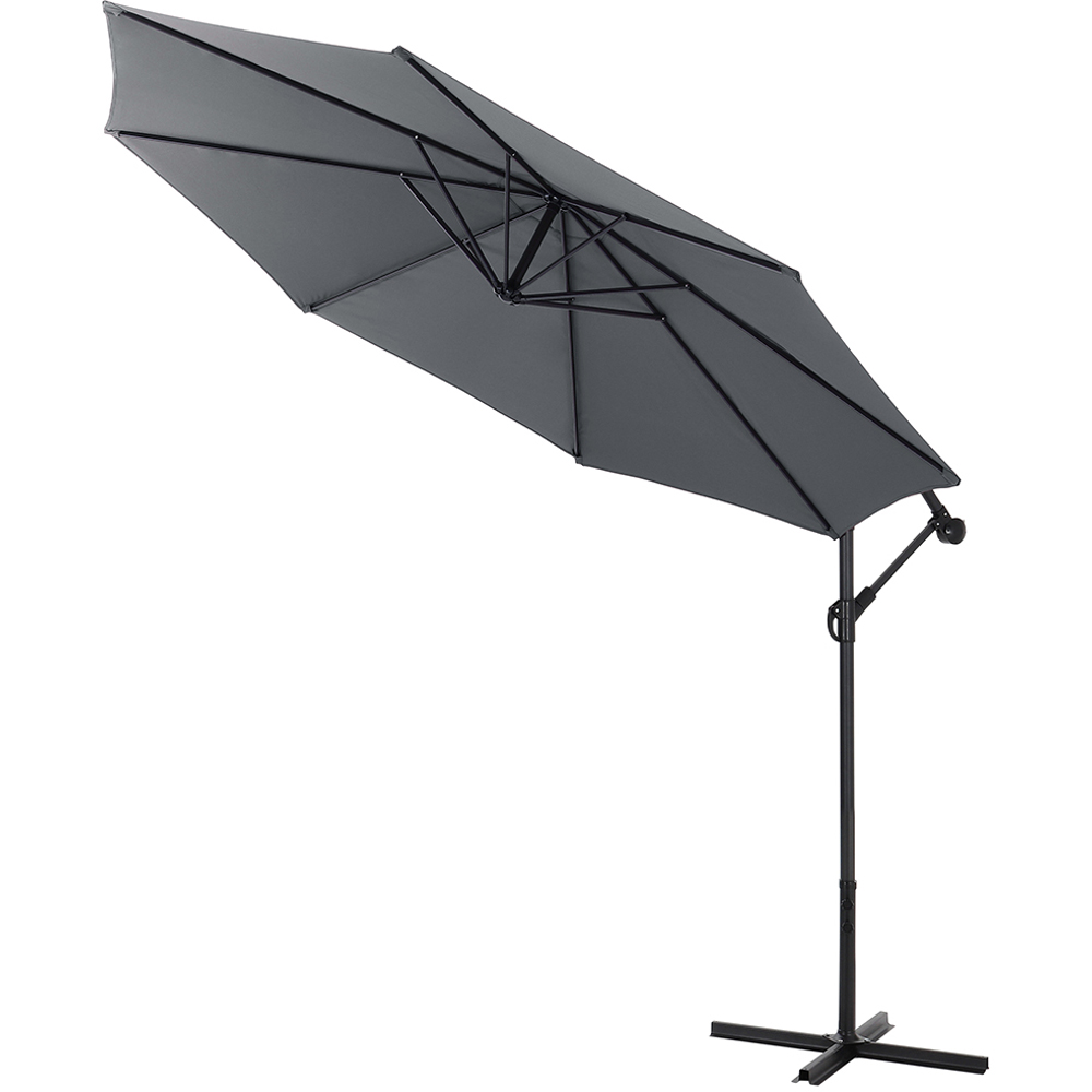 Make a comfortable and style add-on to your outdoor space with this Livingandhome 3m Dark Grey Cantilever Parasol with Cross Base. With this lovely parasol, you can enjoy a comfortable time in your garden. Sturdy and safe, the shade is waterproof and UV-resistant, and it not only provides shelter for you when it rains but also keeps you cool under the hot sun. Featuring high-quality 180g polyester fabrics with top vents and an optional base, this parasol makes a perfect addition to your garden areas. Easy to use, simply lift the slider to extend your parasol outward. Also, with a 3-metre diameter, this hanging garden parasol effortlessly hangs over your dining set or garden setting. Apart from this, it perfectly complements your rattan furniture or outdoor dining table. For added convenience, it includes a crank winding mechanism to open and close the parasol without hassle. Additionally, the inclination angle of the umbrella is adjustable for maximum ease. Material: 8 ribs, 48/42mm metal pole, 180g polyester fabric cover. Pole: 48 x 1mm. Base: 70 x 70cm. Size: 3 x 2.6m. Looking for a way to keep your parasol secure and protected and enjoy some shade? Check out our selection of