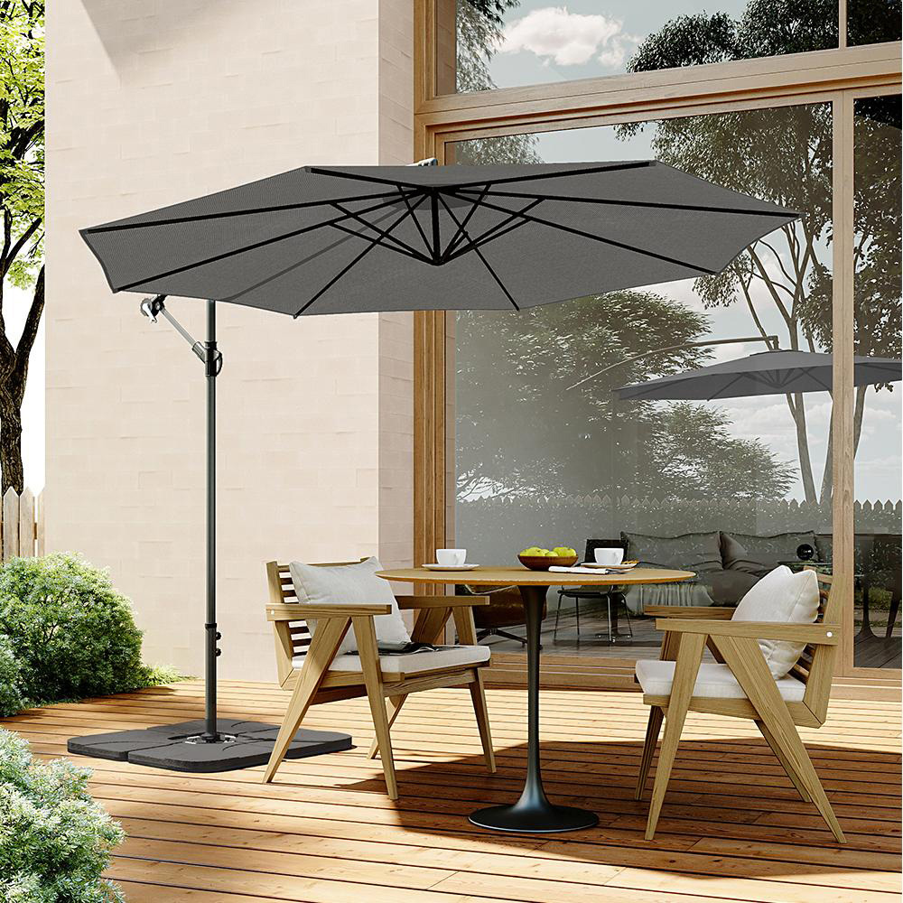 Make a comfortable and style add-on to your outdoor space with this Livingandhome 3m Dark Grey Cantilever Parasol with Square Base. With this lovely parasol, you can enjoy a comfortable time in your garden. Sturdy and safe, the shade is waterproof and UV-resistant, and it not only provides shelter for you when it rains but also keeps you cool under the hot sun. Featuring high-quality 180g polyester fabrics with top vents and an optional base, this parasol makes a perfect addition to your garden areas. Easy to use, simply lift the slider to extend your parasol outward. Also, with a 3-metre diameter, this hanging garden parasol effortlessly hangs over your dining set or garden setting. Apart from this, it perfectly complements your rattan furniture or outdoor dining table. For added convenience, it includes a crank winding mechanism to open and close the parasol without hassle. Additionally, the inclination angle of the umbrella is adjustable for maximum ease. Material: 8 ribs, 48/42mm metal pole, 180g polyester fabric cover. Pole: 48 x 1mm. Base: 100 x 100cm. Size: 3 x 2.6m. Looking for a way to keep your parasol secure and protected and enjoy some shade? Check out our selection of