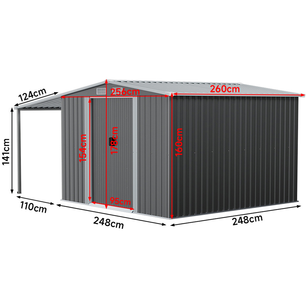 Store all your large equipment in the Living and Home 8 x 8ft Dark Grey Lean-to Outdoor Metal Storage Shed. This dark grey coloured storage shed makes it easy to store the outdoor equipment and assortment of tools. It is crafted from anti-corrosion galvanized steel. This makes sure the shed is resistant to harsh weather conditions and requires minimal maintenance. This spacious includes sliding doors and provides easy access to your sizable tools, promoting efficient organization. The lean-to-shed comes in various sizes, allowing you to choose as per your backyard’s preference.