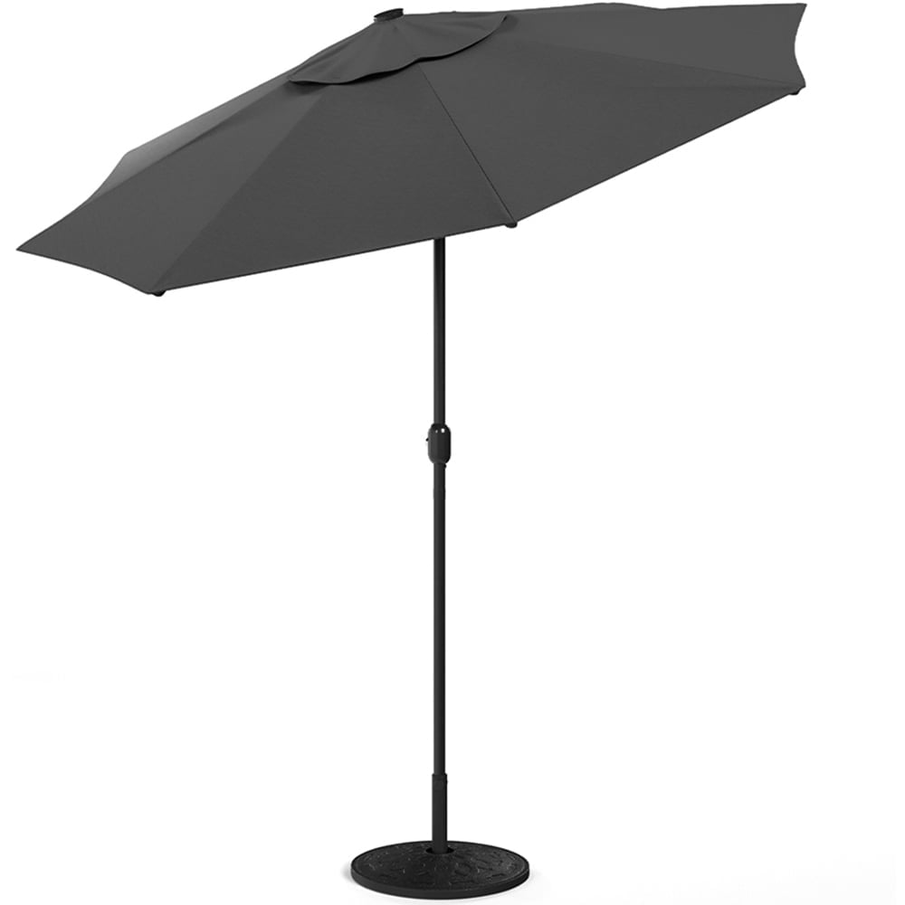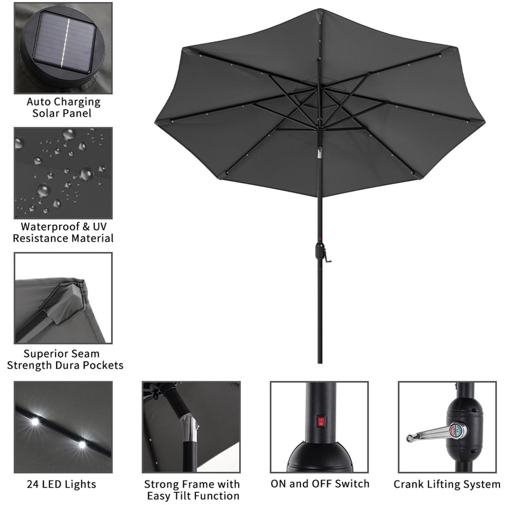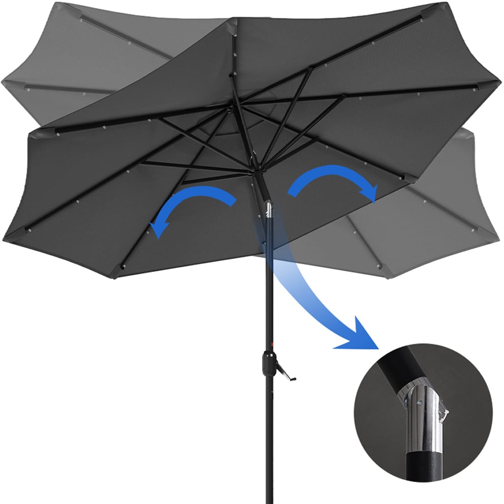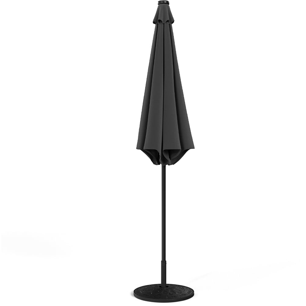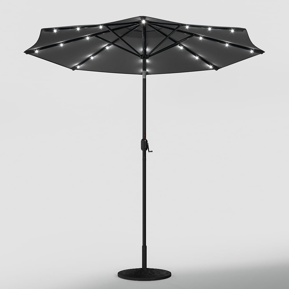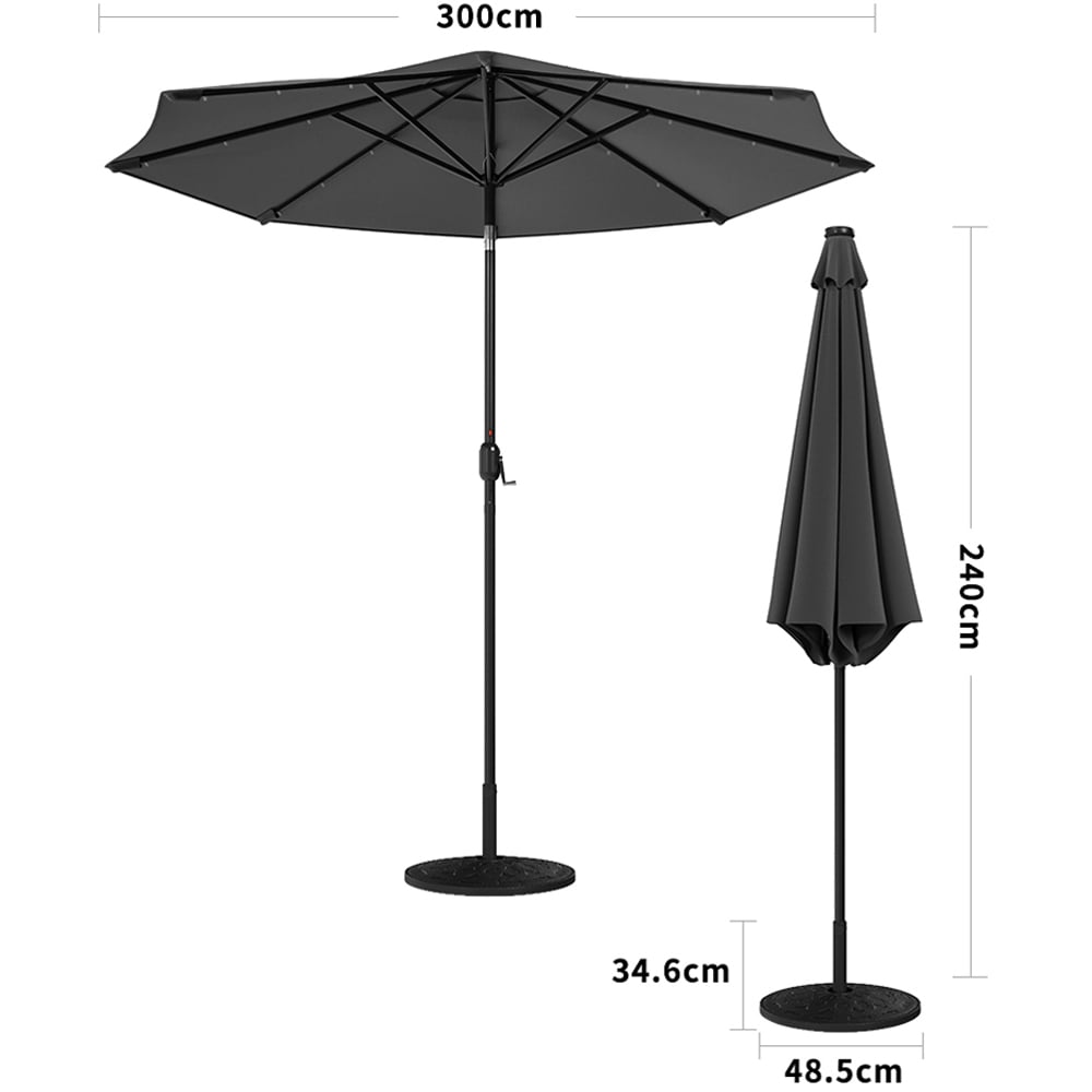 Enjoy your beverages and evening meals on your patio under this Living and Home Dark Grey Solar LED Garden Parasol 3m. Featuring a large canopy that opens effortlessly with a crank lift handle, this parasol delivers excellent shade. Made from high-quality polyester, the octagonal canopy is supported by eight sturdy ribs, complementing a variety of outdoor settings. As night falls, turn on the built-in LED lights to create a romantic ambience. Powered by a solar panel at the top, there’s no need for frequent charging, making this set a perfect choice for both shade and atmosphere. And, the included base can hold your parasol steadily no matter the weather. Note: Two packages may arrive at different times.
