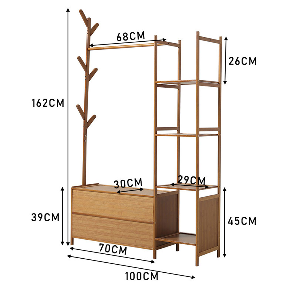 Experience practical storage and organization with the Living and Home Freestanding Bamboo Clothes Rack with Drawers. This multifunctional clothing rack offers ample storage space to keep your items organized. With its four-tiered side shelving, coat tree, hanging rod, and two storage compartments, you'll find the perfect place for your coats, backpacks, shoes, hats, and more. The simple and modern appearance of this rack, with its clean silhouette and natural finish, complements any home decor. The combination of bamboo and fiberboard materials ensures durability and strength. Enjoy a clutter-free and well-organized space with this versatile bamboo clothes rack.