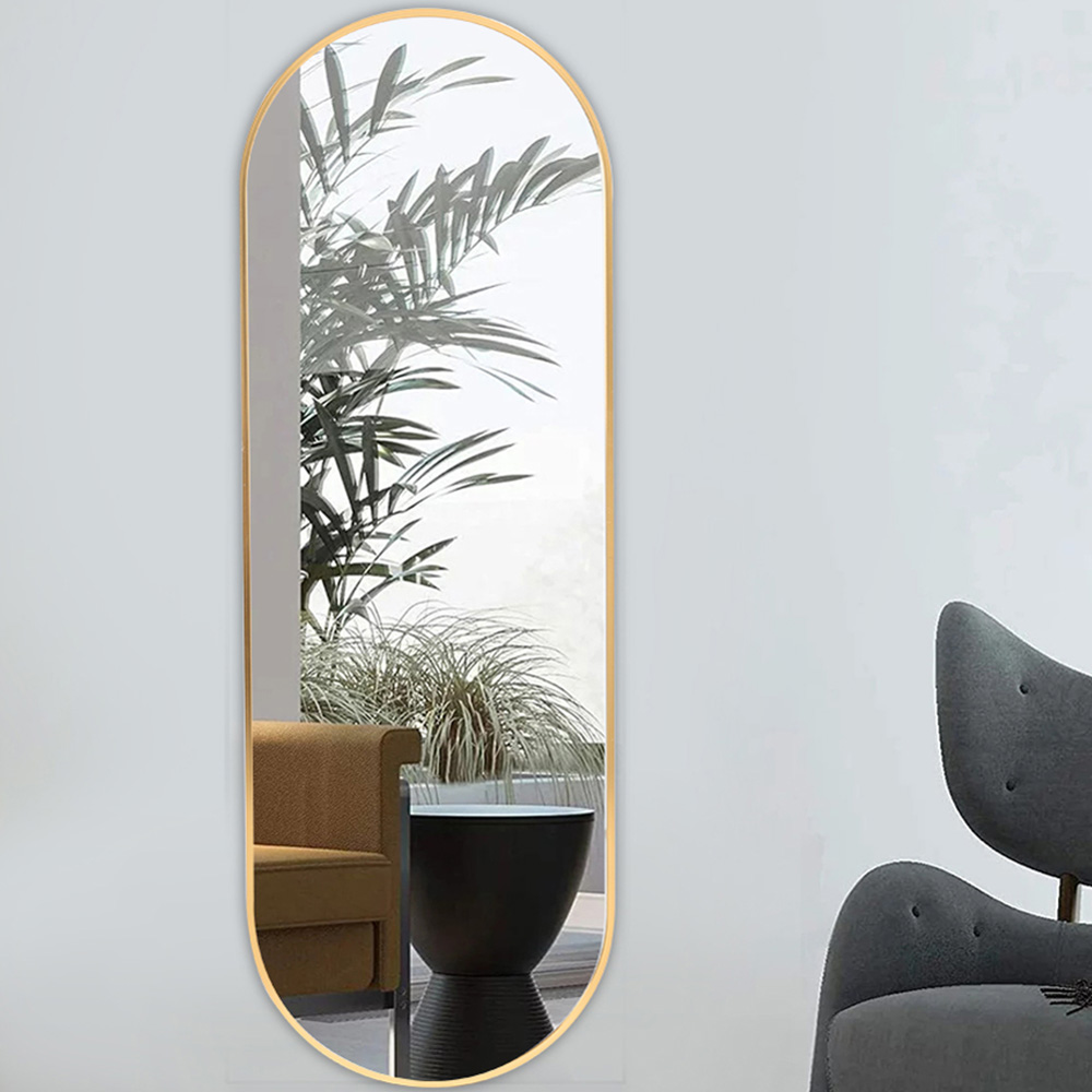 This stunning Living and Home Full-Length Standing Mirror enhances the charm wherever it is settled. Crafted with meticulous attention to detail, this mirror combines a sleek, modern design with a classic arched shape to create a captivating focal point in any room. Its golden metal frame adds a touch of sophistication and versatility, allowing it to seamlessly blend with various interior styles. Whether placed in the bedroom, living room, or hallway, this floor mirror exudes a sense of timeless beauty. Size: 40 x 120cm.