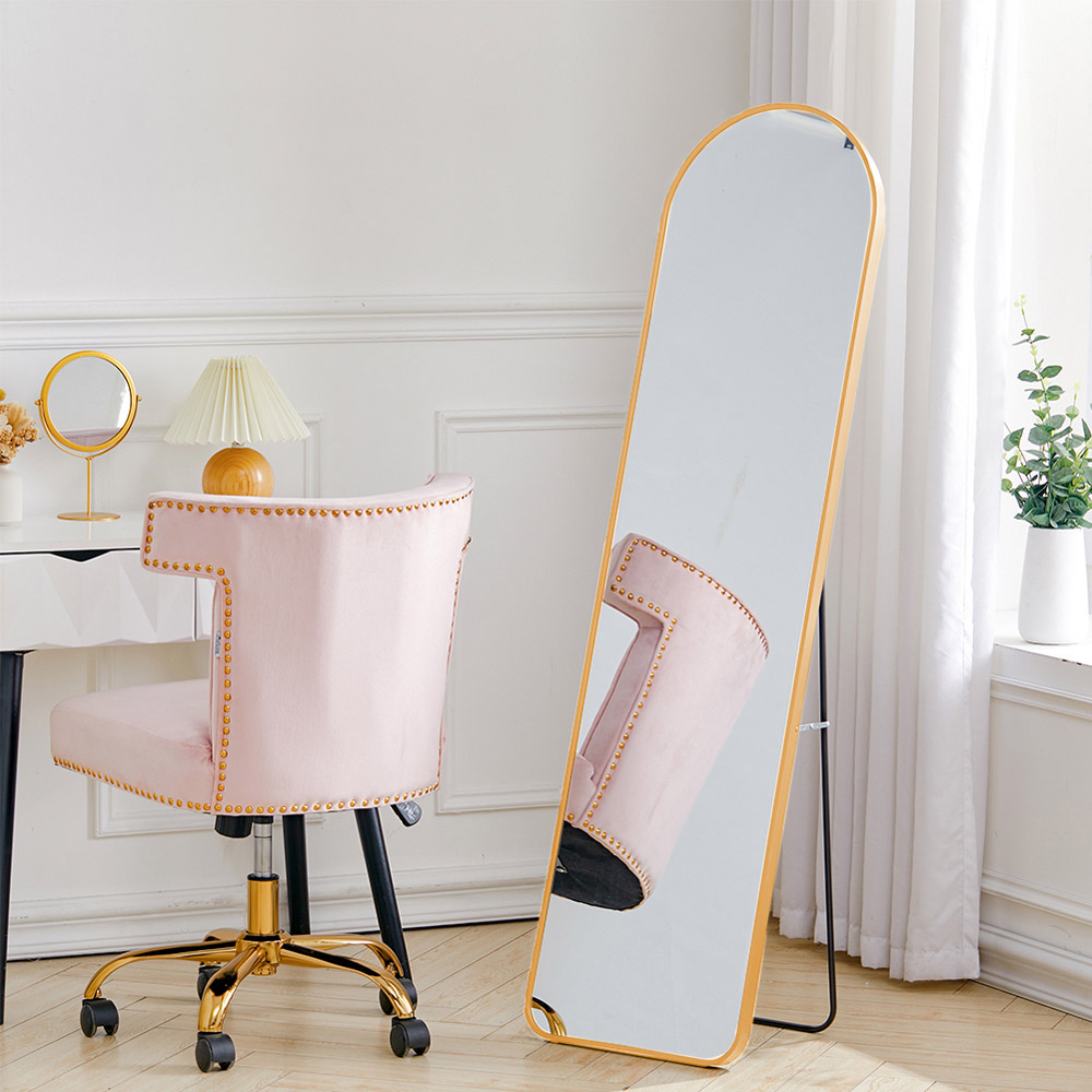 This stunning Living and Home Full-Length Standing Mirror enhances the charm wherever it is settled. Crafted with meticulous attention to detail, this mirror combines a sleek, modern design with a classic arched shape to create a captivating focal point in any room. Its golden metal frame adds a touch of sophistication and versatility, allowing it to seamlessly blend with various interior styles. Whether placed in the bedroom, living room, or hallway, this floor mirror exudes a sense of timeless beauty. Size: 40 x 150cm.