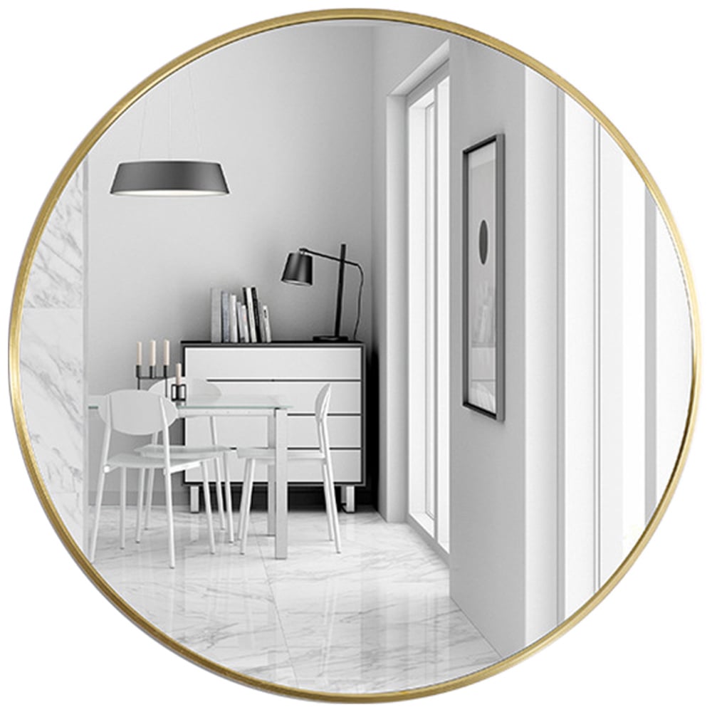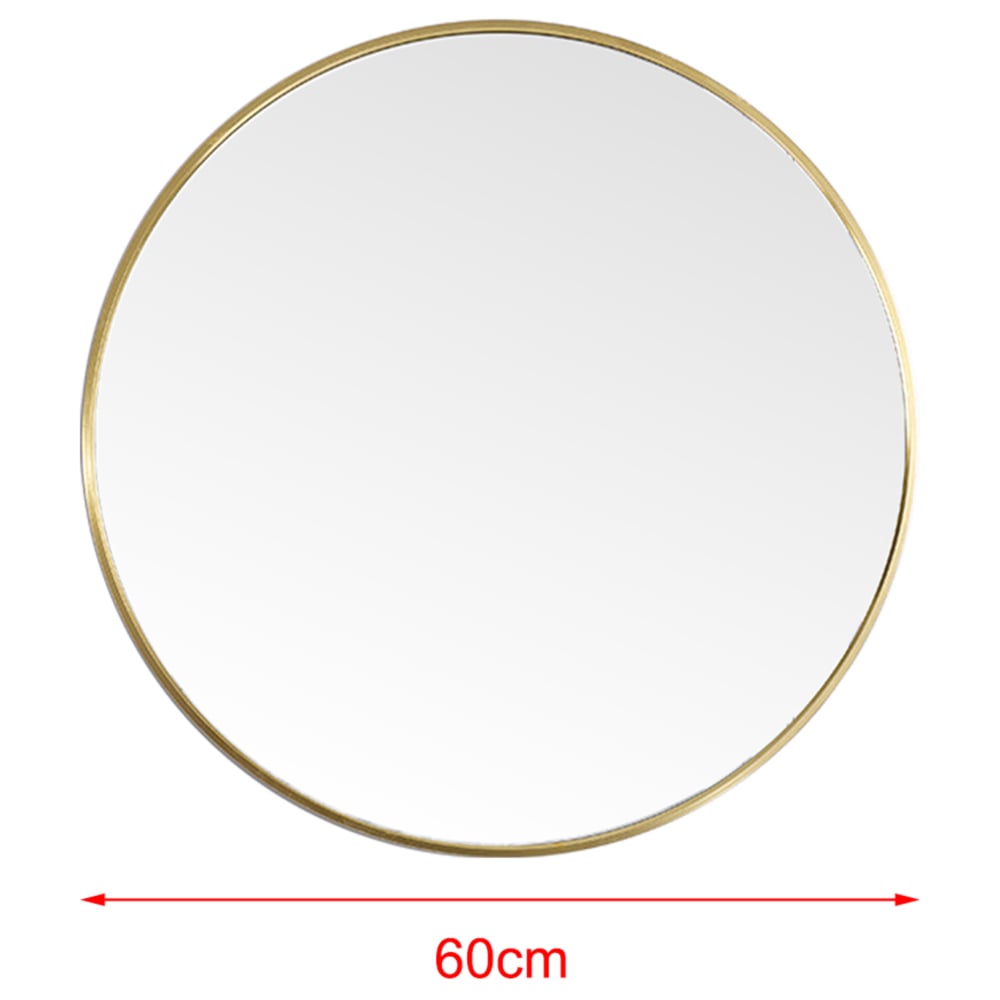 Inject style and function in your living space with this Living and Home Nordic Wall Hanging Gold Round Framed Bathroom Mirror 60cm. Features a sleek and slender round metal frame with a minimalist style, making it ideal for hanging up in modern-style bathrooms and hallways. A simple yet classically designed mirror, perfect for quick check-ups before you leave the house. The extra-large-sized mirror has a fast defogging quality to provide precise imaging and is covered with an anti-explosion film.