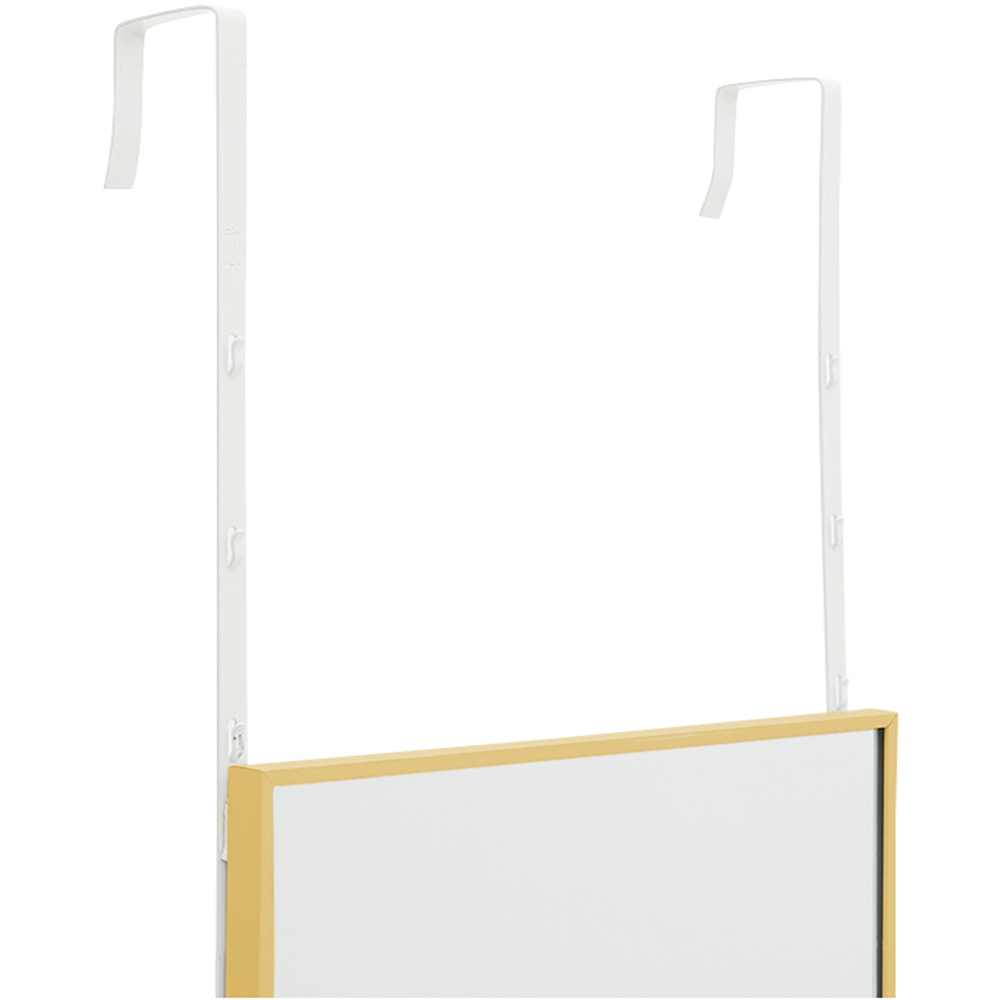 Elevate your baths with this Living and Home Over Door Full Length Mirror. The slender and clean frame in a stylish gold finish of this full-length mirror highlights the glamour of simplicity. To add versatility, the mirror provides multiple ways to reflect your beauty. If your room space is a bit limited, you can use the metal hook to hang it on your door. Also, if your wall is too plain, you can use the stickers to mount it on the wall. Apart from this, if you prefer a more casual way, just simply lean it against the wall. Size: 28 x 118cm.