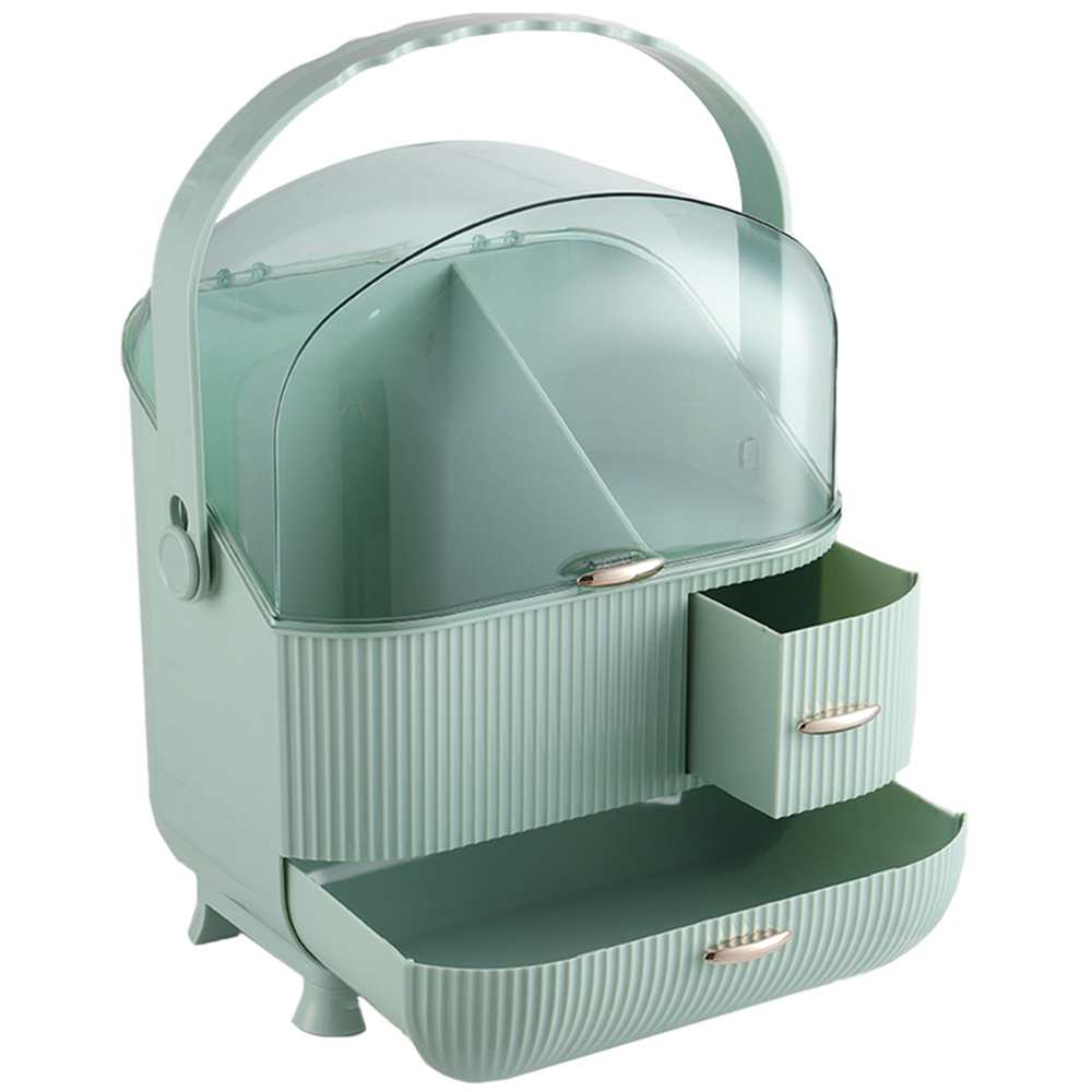 Crafted from high-quality materials and designed for convenience, this Living and Home Green Large Makeup Organizer is essential for any makeup enthusiast. It offers three-layer partition storage of varying sizes, perfect for sorting and organizing your items. It's made using premium plastic for durability and is waterproof and dust-proof with a transparent cover. Complete with a convenient carrying handle, making it ideal for moving from room to room.