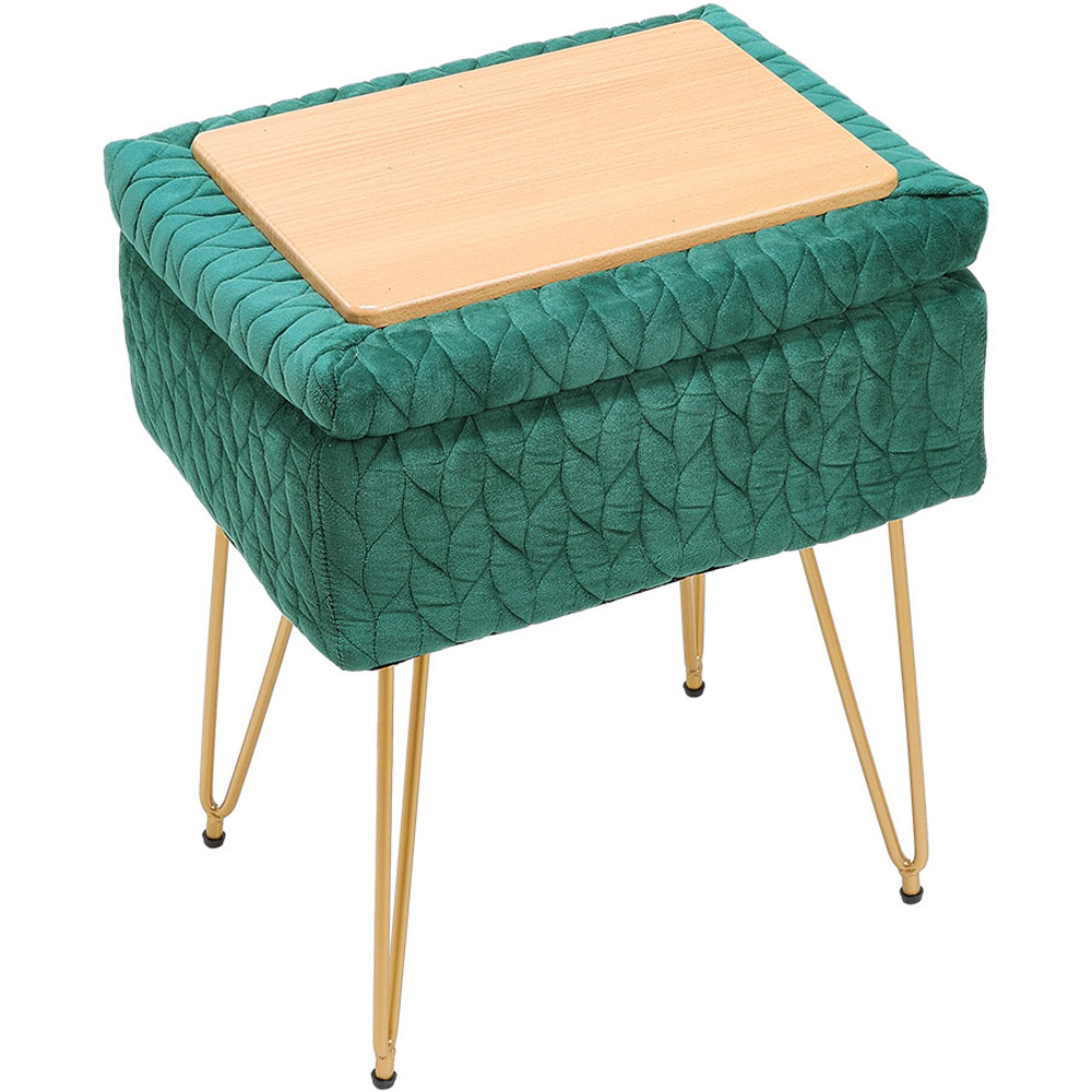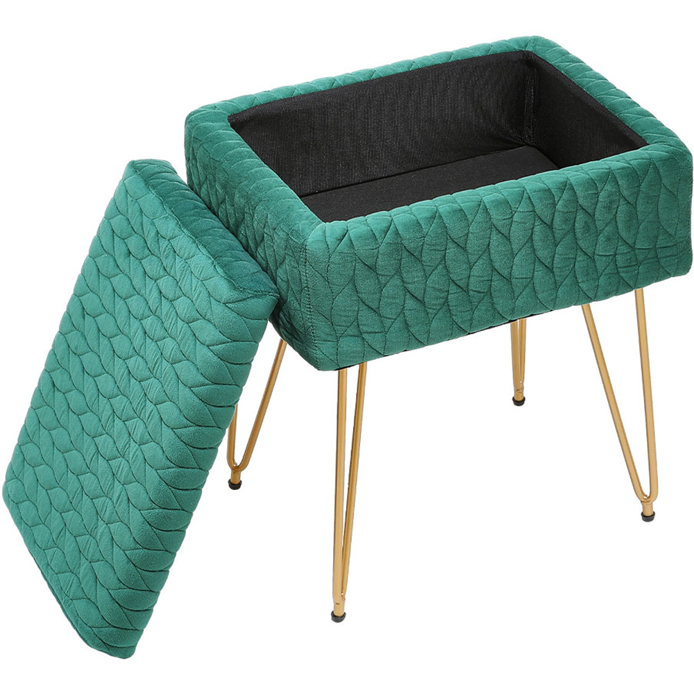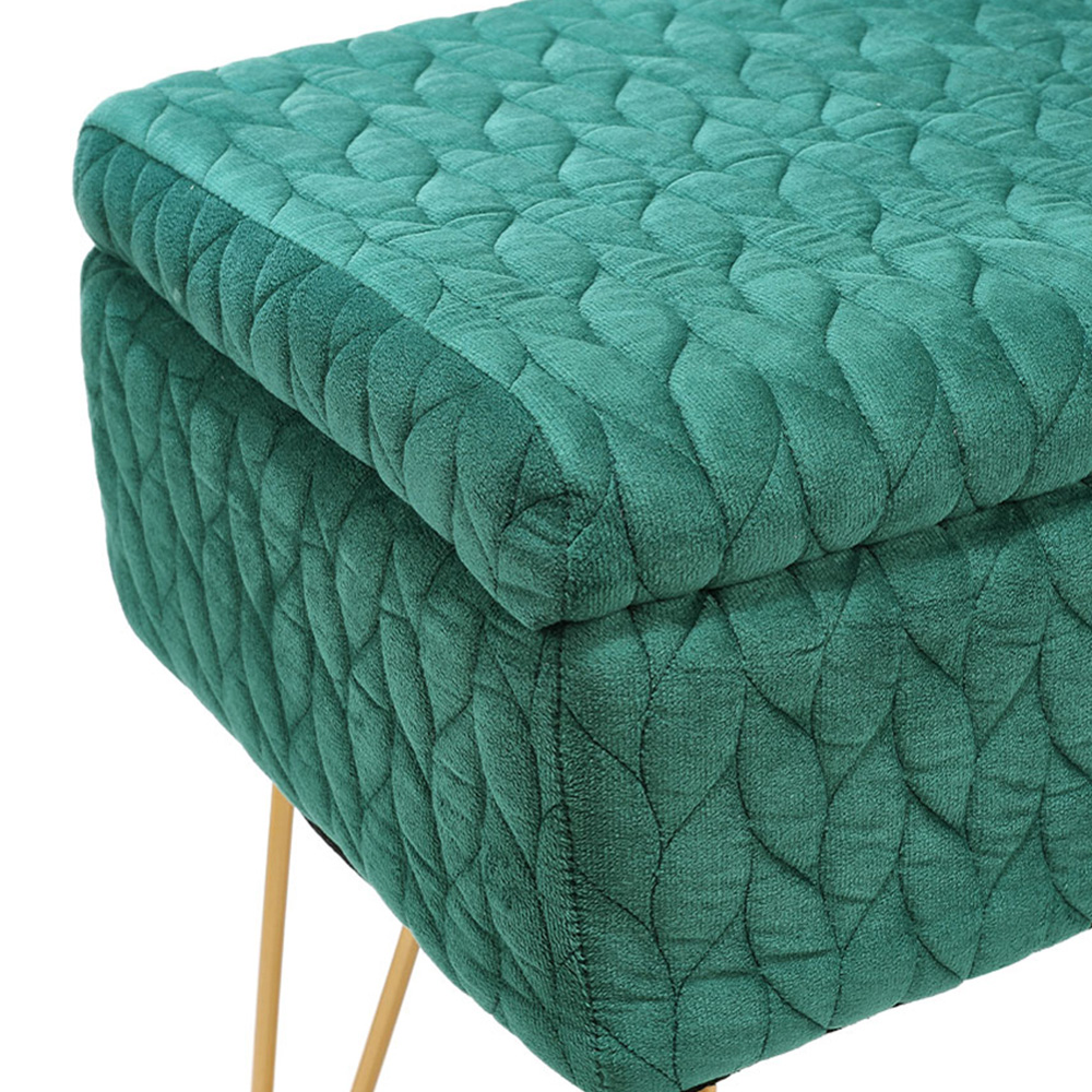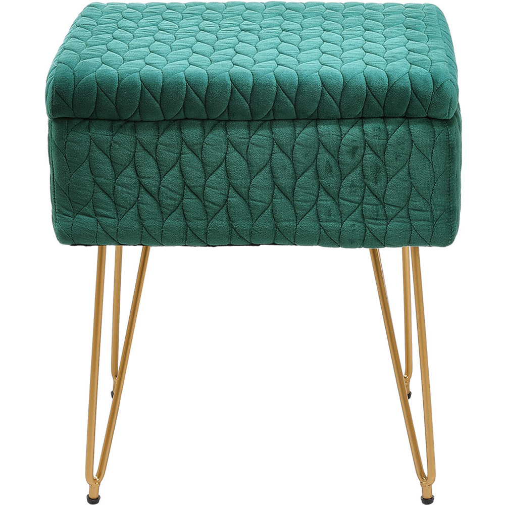 Elevate your space in style with the Living and Home Green Rectangle Upholstered Ottoman Vanity Stool with Storage. This versatile vanity stool gives you a spot to sit while it can be used as a storage stool for storing your stuff. The wooden lid top and durable metal legs make this accent ottoman perfect as a serving tray or tray-top coffee table, holding drinks and snacks. What is more, the top of this ottoman lifts to reveal a hidden storage compartment that is perfect for blankets or other clutter. Note: This item requires assembly.