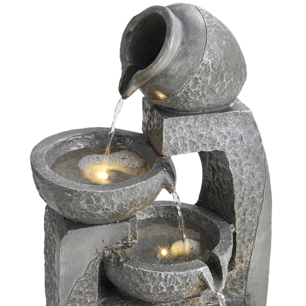 Introduce an enchanting touch to your garden with this exquisite handmade water fountain, boasting a beautifully rippling surface that enhances the natural beauty of your outdoor space. As water flows gracefully from the jug into the various bowl layers, it creates a soothing sound that adds to the tranquil atmosphere. When illuminated, the water appears to glisten with golden hues. Position it under direct sunlight and enjoy the delightful ambience it offers effortlessly. Crafted from low-maintenance resin, this fountain is designed for long-lasting outdoor use, enriched with energy-efficient LED lights. Ideal for small gardens, patios, and balconies. Dimensions: H64 x W28 x D22cm. Wattage is 2.4W. Material: Resin. Pump Included: Yes.