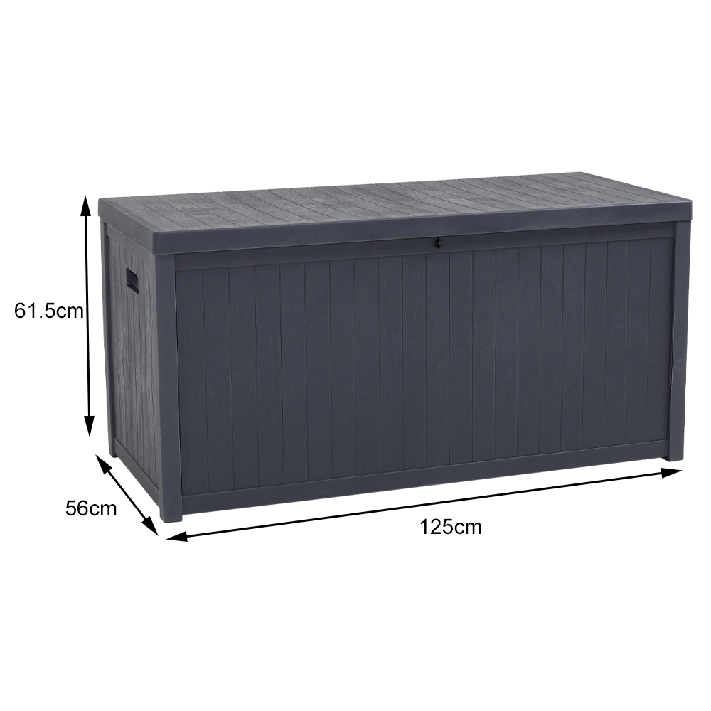 Tame all your outdoor tangle with the Living and Home Grey Cushion Storage Box. This heavy-duty storage box is your secret weapon for a clean and organised storage space. The storage box is crafted from high-quality PP material, ensuring a weatherproof build. Integrated handles make it a breeze to move the box around. Keep your belongings safe and secure with the handy lockable lid. Dimensions: H61.5 x W56 x L125cm. Storage Capacity: 430L.