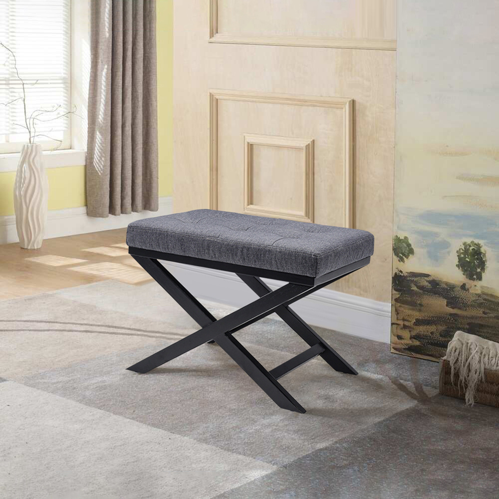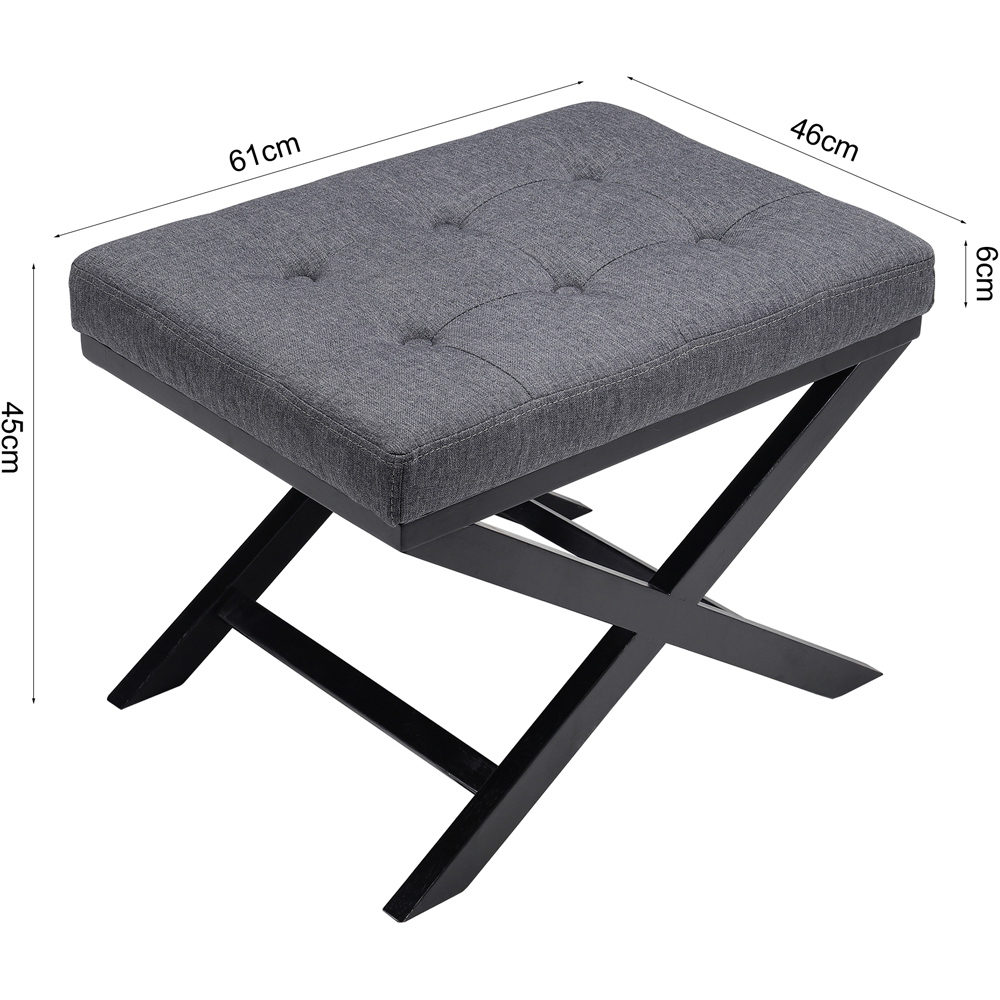 This delicate stool blends traditional style with a modern touch, featuring linen upholstery detailed with classic button tufting that complements any home interior. Its X-shaped legs, reinforced with connecting bars, provide both sturdy support and stylish design. Equipped with anti-slip pads on each leg, the stool stays steady and secure on any floor. A versatile and essential piece, it’s the perfect addition to every home.