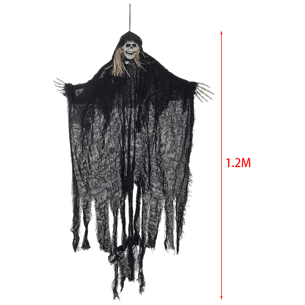 Add a chill to your Halloween celebrations with the Living and Home Halloween Hanging Skeleton Ghost with Motion Sensor 120cm. This imposing spectre stands at a staggering 120cm tall, draped in tattered clothing that eerily sways with the slightest whisper of wind, creating a chilling and haunting effect. As soon as anyone approaches, an infrared sensor activates a bone-chilling scream from the ghost, while its eyes light up ominously, adding to the eerie spectacle. Perfect for adorning your porch, or garden, or transforming your home into a bone-chilling masterpiece this Halloween. Equipped with a built-in motion sensor that triggers ghostly movement and unsettling sounds. Plus, it's durable and lightweight, making it easy to hang and store.