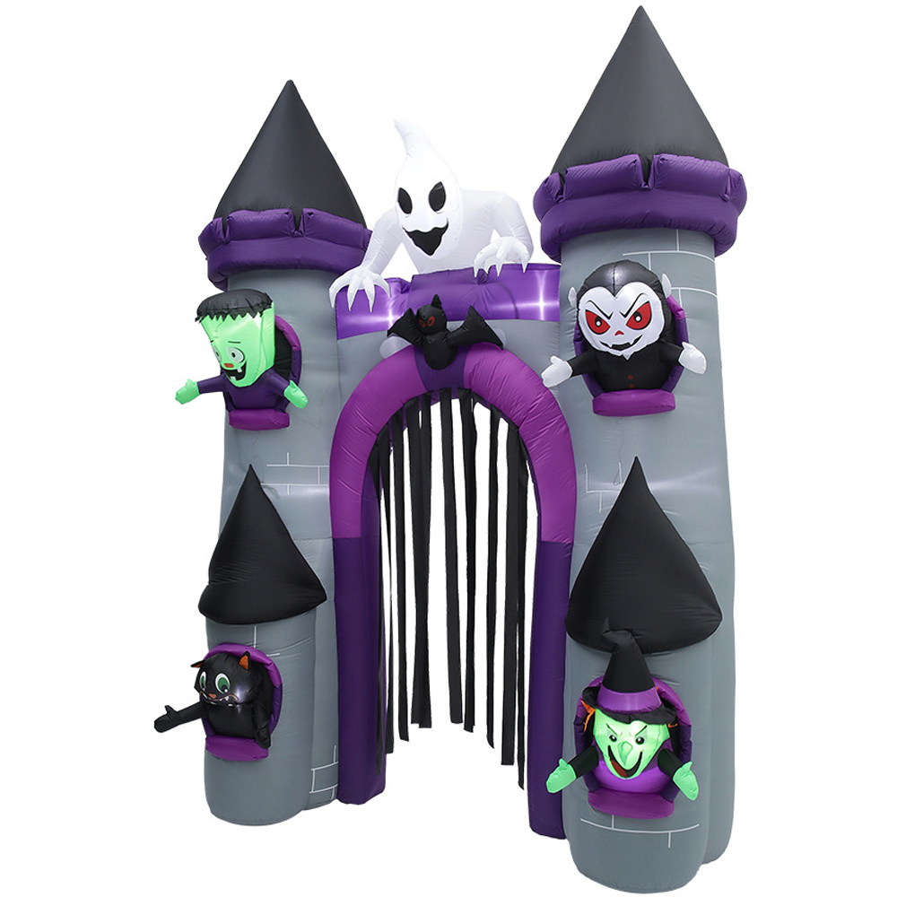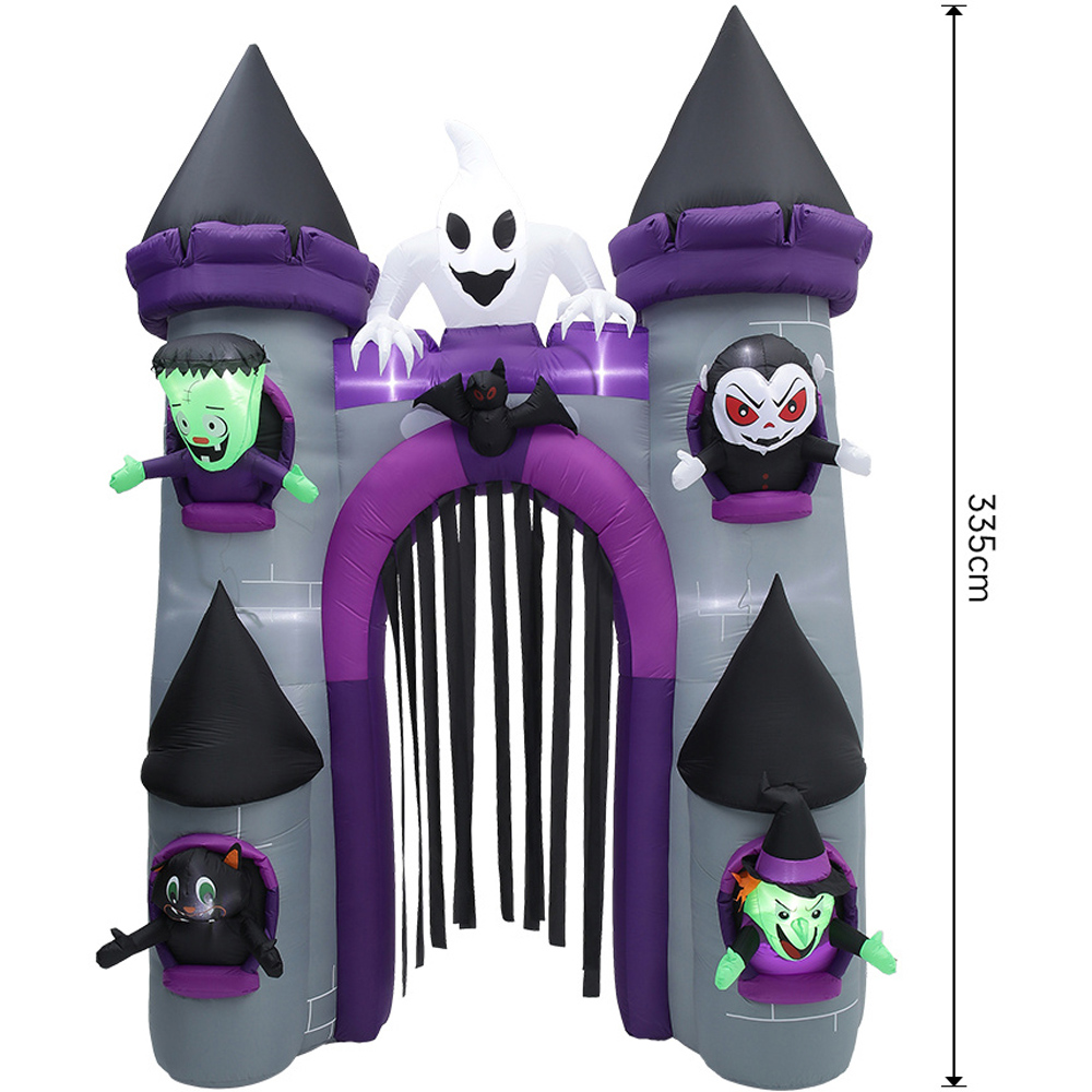 Add a chill to your Halloween celebrations with the Living and Home Halloween Inflatable Haunted Castle LED Arch 335cm. Made from durable all-weather polyester, this inflatable features a haunting figure guarding the entrance, inviting you to step into a world of enchantment as you walk through shimmering ribbons. The spooky LED lights illuminate the inflatable, adding to the spooky atmosphere and making it the centrepiece of your Halloween display, sure to captivate all who lay eyes on it. Plus, it inflates in minutes for quick setup. Dimensions: 337 x 242 x 100cm.