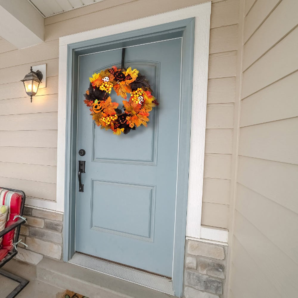 Welcome, all the trick-or-treaters to your home with this Living and Home Halloween Skull Leaf Door Wreath. It features an assortment of withering maple leaves, yellow berries and eerie Halloween-themed ornaments springing from a woven branch ring. It is equipped with a 2m LED string for a stunning look at night. When lit at night, the wreath looks even more amazing and oozes a quirky vibe that you will love. Hang it on your door to spruce up the Halloween decor.
