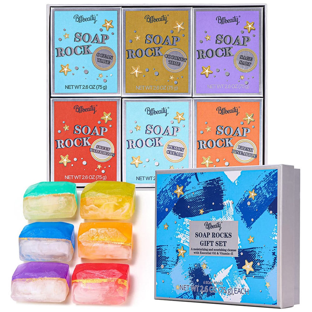 Elevate your daily cleansing routine with Living and Home Hand Soap Bar 6 Pack. This set of six enchanting fragrances includes Fresh Pineapple, Ocean Waves, Sage Salt, Coconut Time, Lemon Cream, and Sweet Watermelon. Crafted by a professional research and development team, these soaps blend coconut and palm oil for a cleansing experience that's moisturizing and suitable for all skin types. The ergonomic design ensures a secure grip, making each use a pleasure. It could be thrown into the mesh bag and hung against the wall, which takes up no place. This cruelty-free, vegan, and eco-friendly soap set is a must-have for indulgent, everyday care, whether at home or on the go. The set comes packed in an exquisite gift box, which can be an ideal gift for women, mothers, friends, or colleagues.
