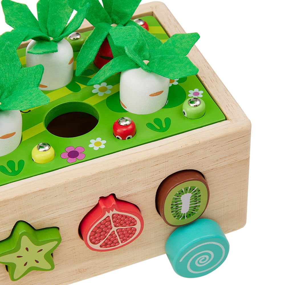 Spark joy and imagination with the Living and Home Kids Montessori Toy Wooden Building Block Set. This set of wooden building blocks encourages hands-on play and mental challenges for children. It includes eight carrots, one magnetic rabbit, ten magnetic worms, 12 kinds of fruits, and one wooden car. Children can harvest carrots, catch worms and match fruits, having hours of endless fun. Crafted from natural wood and painted with safe, non-toxic paint, this set has smooth surfaces for safe play. All the pieces can be stored in the wooden car for easy cleanup. It helps children develop counting as well as colour and shape matching skills. This set serves as an ideal gift that ensures excitement among children.