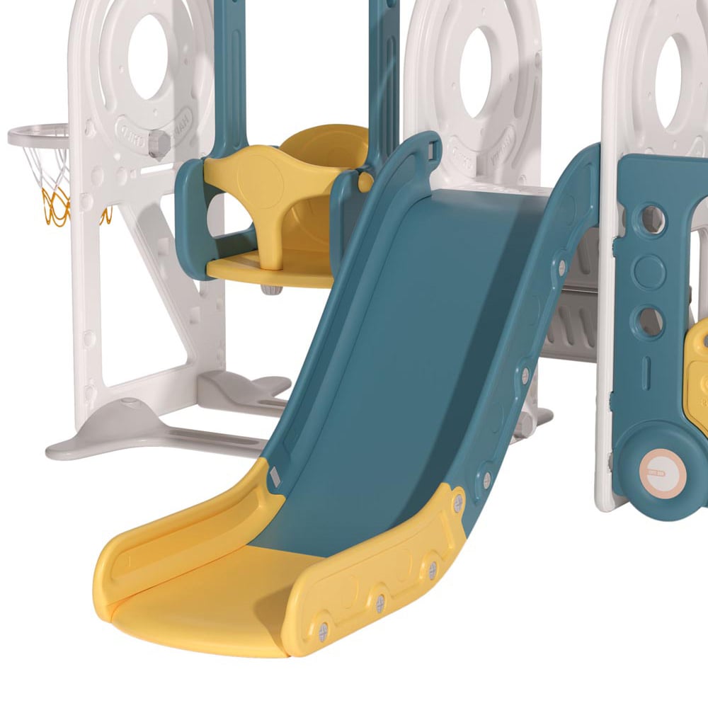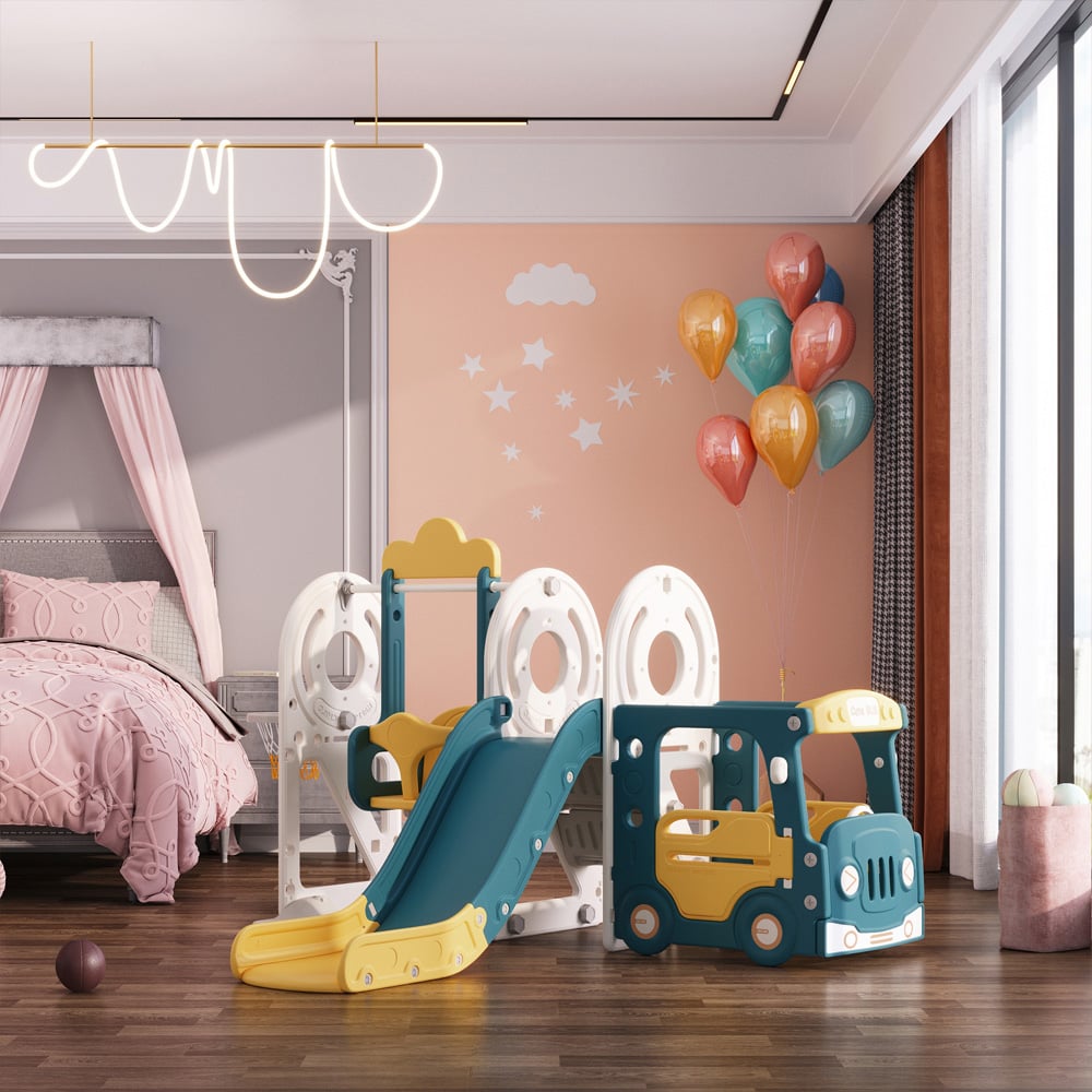 Elevate your child's playtime with the Living and Home Kids Yellow and Green 3-in-1 Climber Playset with Swing and Slide. This playset is designed to provide hours of fun for Toddlers. It features a colourful bus-shaped frame with a swing, slide, climbing ladder, and basketball hoop. The set is made from high-quality materials that can withstand regular use for years. The swing is equipped with a protector to keep your child secure while swinging, and the slide has raised sides for added safety. The climbing ladder has easy-to-grip handles for better stability.