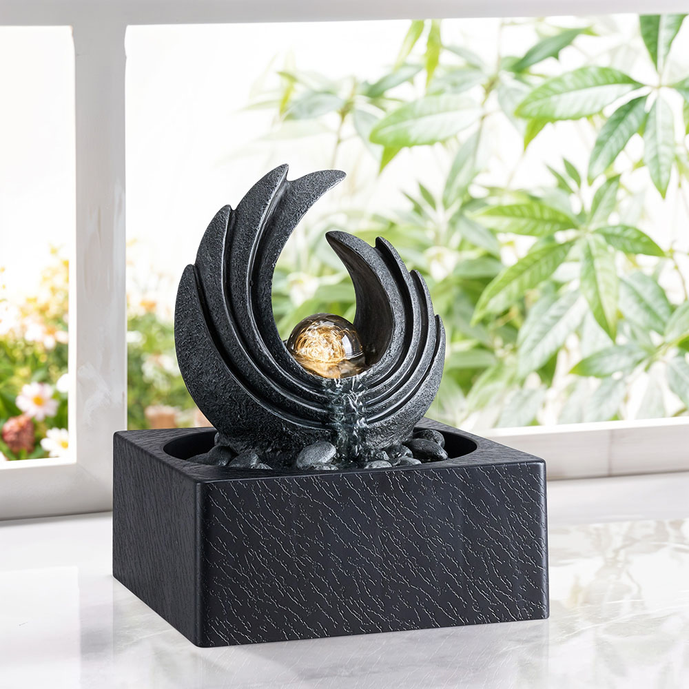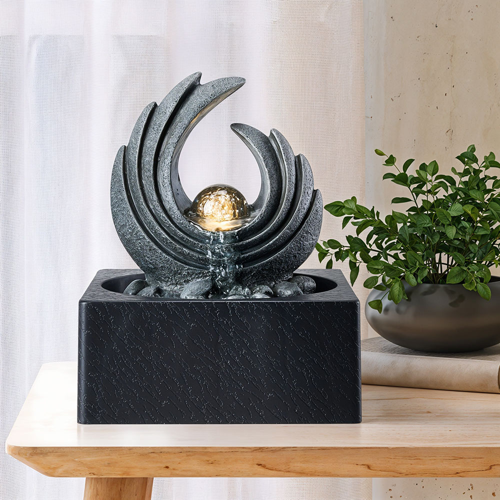 Transform your space with this elegant water fountain. Its smooth, curved design echoes the flow of dancing water, adding a sense of grace and movement. At the centre, a sphere gently releases water, creating a striking focal point. The soft trickle offers natural white noise, helping to ease stress and improve focus. Built-in LED lights cast a warm glow in the evenings, setting a calm and cosy mood. More than just a fountain, it’s a stylish piece of art that lifts any room’s look. Ideal for homes or offices, and a thoughtful gift for moments of peace.