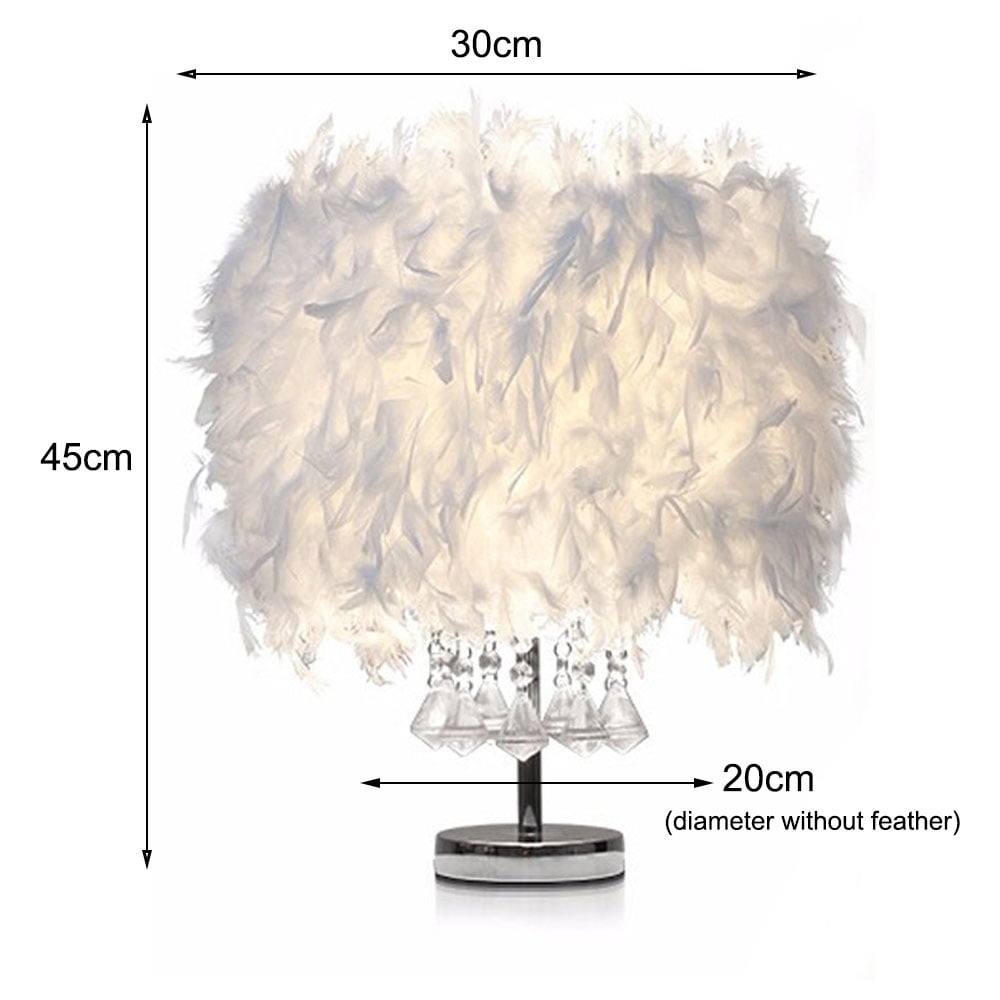 Illuminate your space in style with this Living and Home LED Table Lamp with Transparent Crystals Feather Lampshade. The lamp features a sturdy silver metal base with a glossy finish and a contrasting fluffy white feather with transparent crystals lampshade that brings romance to the living room. From its slick base to the unique light that reflects the white feather, the table lamp gives an advanced visual experience. Ideal for placing on any surface without taking up too much space, this table lamp will fit in any environment, adding a charming atmosphere to any room. It's perfect for the bedroom, bedside and nightstand, the lamp will be a stand-out feature in any living space. Dimensions: H45 x W30cm, Base Diameter: 20cm. Please click here to find our range of lightbulbs.